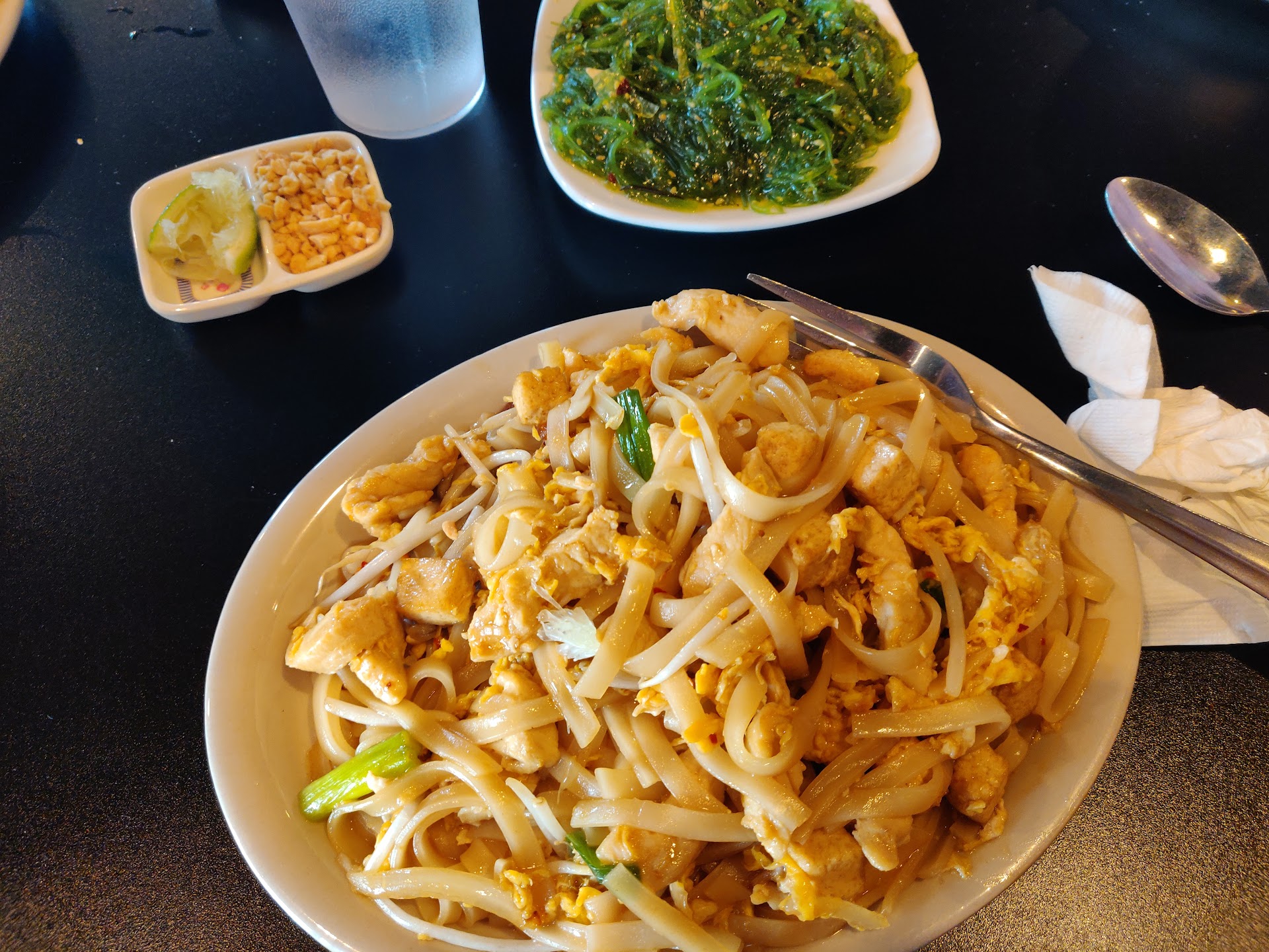 To my surprise, we all ordered Pad Thai. The noodles were thicker than I've ever had for a Pad Thai before. One of us also ordered the seaweed salad. Soon as the food arrived, we got quiet and got busy eating. It was good. The flavor was spot on and the servings generous for one meal. It served to quelch our cravings and fill our tummies and get us back on the road.