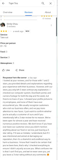 My experience with Tiger Tea was on July 21st, 2023. So the situation might have already changed now. Food: I ordered brown sugar milk with boba. To me, as a bubble tea lover since I was 12, I think the brown sugar tastes a bit artificial. The amount of boba was not enough, I ate them all halfway of finishing my drink. But once again, this is just how it feels to me. And everyone has their own tastes and favor. Atmosphere: To me, the arrangement of tables and chairs were a bit odd to me. And the flow from order to pick up was not very smooth. Once again, it is just my opinion from my experience last year. Service: Nothing special to me. Not extraordinary and not bad. They gave my order correctly. But after seeing their reply, I would not consider revisiting in the future. Others: I think Tiger Tea can definitely doubt if I am just a random person to harm their review (by giving 3-star lol). But if they truly wish to know my opinions and improve their business, they should have addressed their response kindly and politely instead of how suspicious they are and they are "not unjustly accuse me " . I also understand they don't want anyone to blemish their reputation. Once again, you can always do it with curtesy.