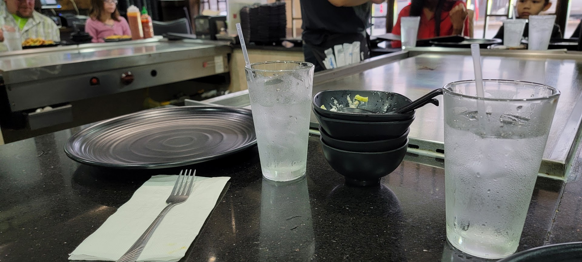 The food here was absolutely amazing. My wife ordered the hibachi salmon with fried rice. I ordered hibachi chicken with fried rice. Both were served with grilled vegetables and all of it was cooked to perfection directly in front of us. Prior to our main course, we were served Japanese soup and salad, which were both very tasty. The hibachi chef was top-notch and very experienced at his trade. He was also comical and interacted extremely well with the children of the family that was seated with us. The food portions were very plentiful, and we departed with leftovers. Everyone at that grill left the steakhouse happy and well-fed. Our only complaint was that our drinks ran dry and our waiter (not the hibachi chef) mever returned to give us refills. There was a water pitcher close by, and I took the liberty of refilling mine and my wife's cups (no big deal). The restaurant was very busy that night, so it was probably a fluke. We will definitely return in the future to try different menu options, and I recommend that you give this place a try as well. Sadly, I only took one photo while we were there, and it doesn't represent the atmosphere very well at all. It does give you an idea of how the grills are set up. I'll try to do better on...