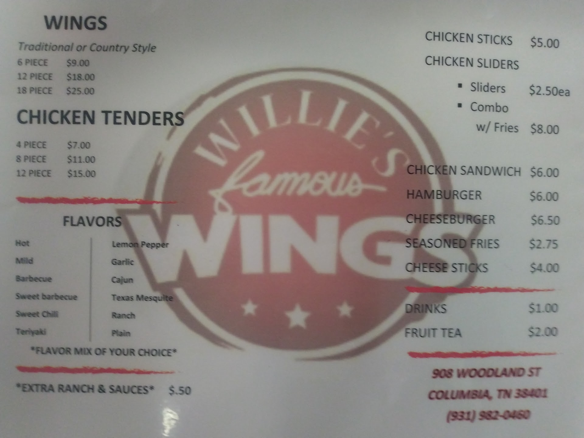 To start this review I just want to say that this was our first time visiting Tennessee and I’ve never been to Columbia, TN. My family and I were very hungry and my wife choose Willie’s because of the reviews. When I first turned down the street I felt a little unsafe because the buildings look rundown and it was early evening. When we first walked up to Willie’s we were greeted by some of the neighborhood people. We felt a little uncomfortable because who doesn’t feel uncomfortable around strangers in a strange neighborhood. When we first saw Willie’s I assumed the wings may not be that good but because we were so hungry I said let’s just try. Willie’s is the perfect example of don’t judge a book by it’s cover. The place was clean, the workers were very nice and the wings were great. I’m so glad we stopped in. They had the best buffalo wings I’ve ever had. And the ranch sauce was tasty. I can’t wait to comeback to Willie’s...