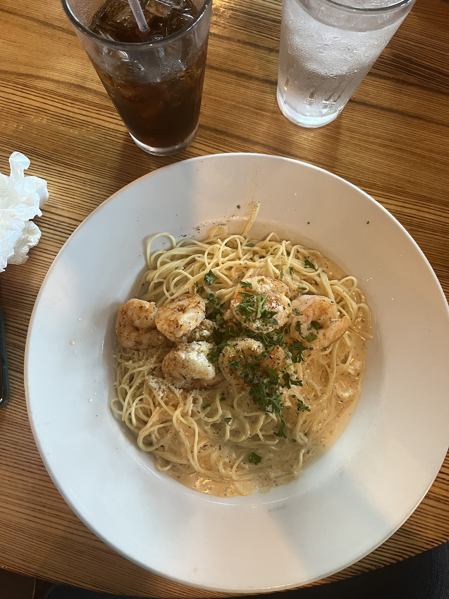 Went out alone for a late night dinner. Got there 8pm on a Saturday, the host got me sat within 10 mins. Kind of awkward to be at a center spot table for 4 in the middle of a busy restaurant but that is no big deal. My server was nice enough, she did forget about the no tomato instruction for my pasta, and didn’t really apologize after I picked them all out. Part of the reason for this mistake is that they are not allowed to write what I ordered but remember it from memory, which is quite stupid if u ask me, that rule should be changed. The food was delicious nonetheless, their Cajun shrimp pasta has always been my fav; pizza is usually great as well. Lovely atmosphere! Great space to hang out with family and friends!