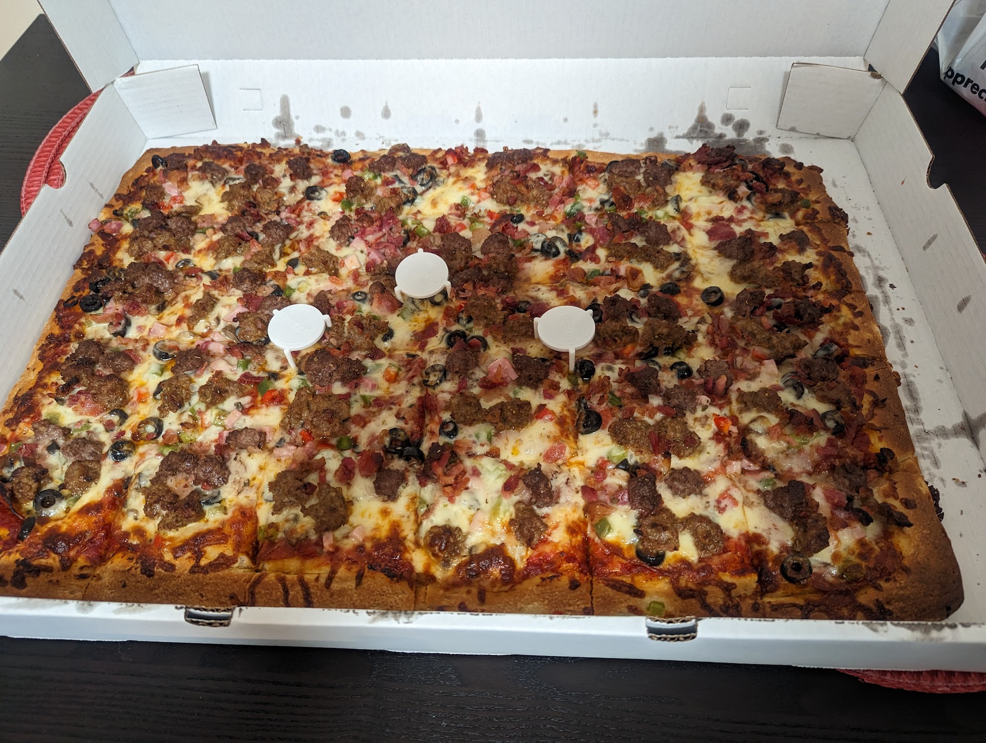 I remembered this pizza from my college days, and when we were back in town staying at an AirBNB it was time for a trip down nostalgia lane. Blood pressure and cholesterol meds be DAMNED, it was time to throw caution to the wind and get a pizza loaded with as many toppings as they could load on. We started with the meat pizza, and went to town with added toppings!