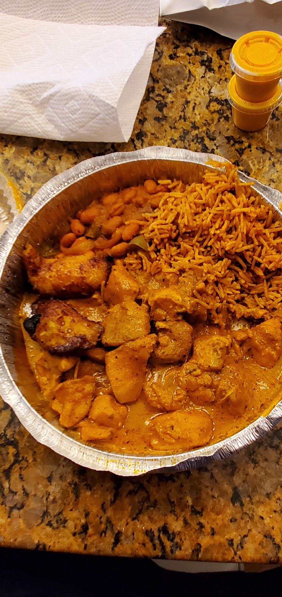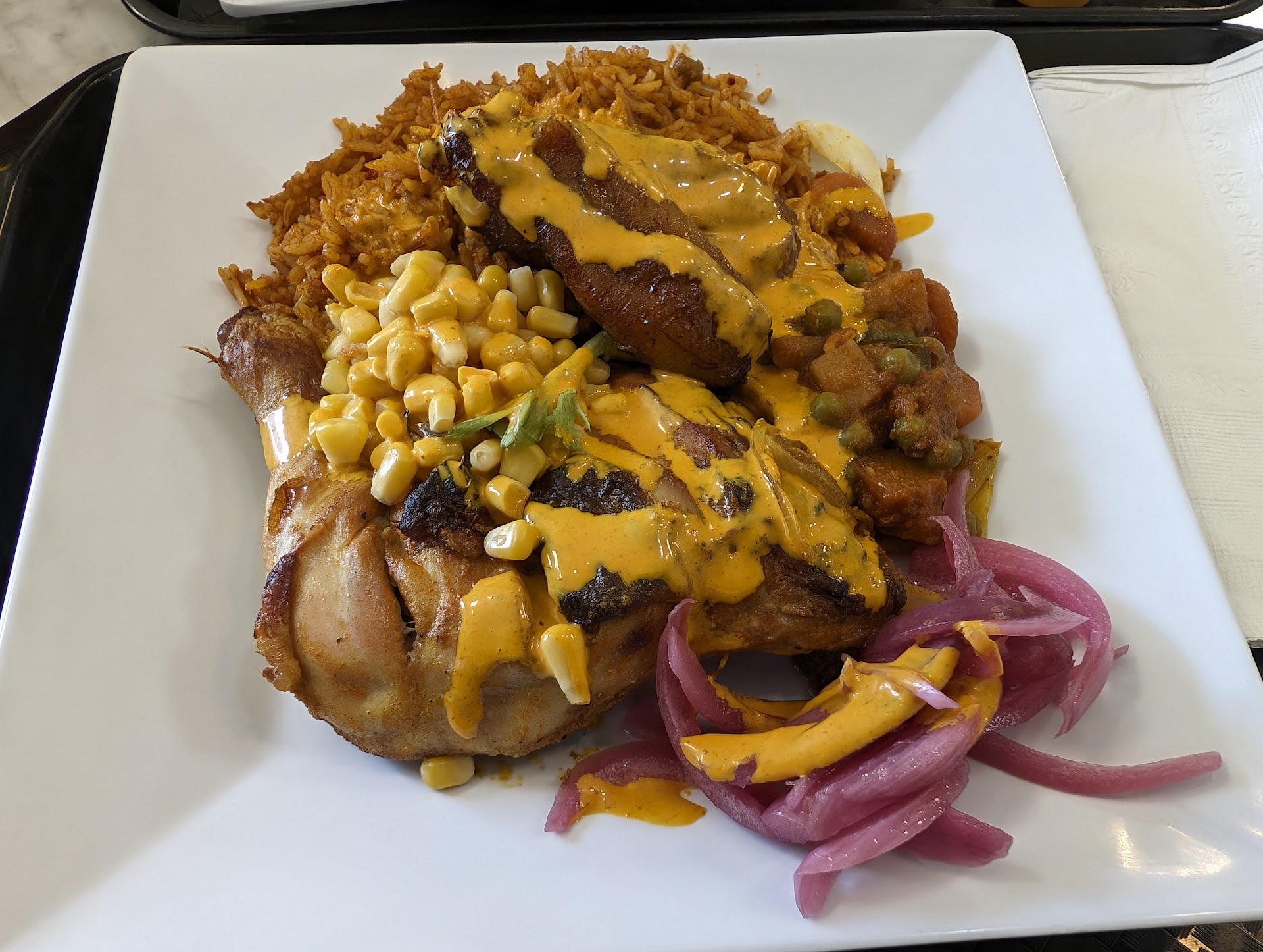 Food: we ordered the Pilipi chicken and the Chicken Afra both with Jollop rice, beans, plantains and corn. Protein: both dishes had very tender and flavorful chicken. Not one bad bite with either chicken.