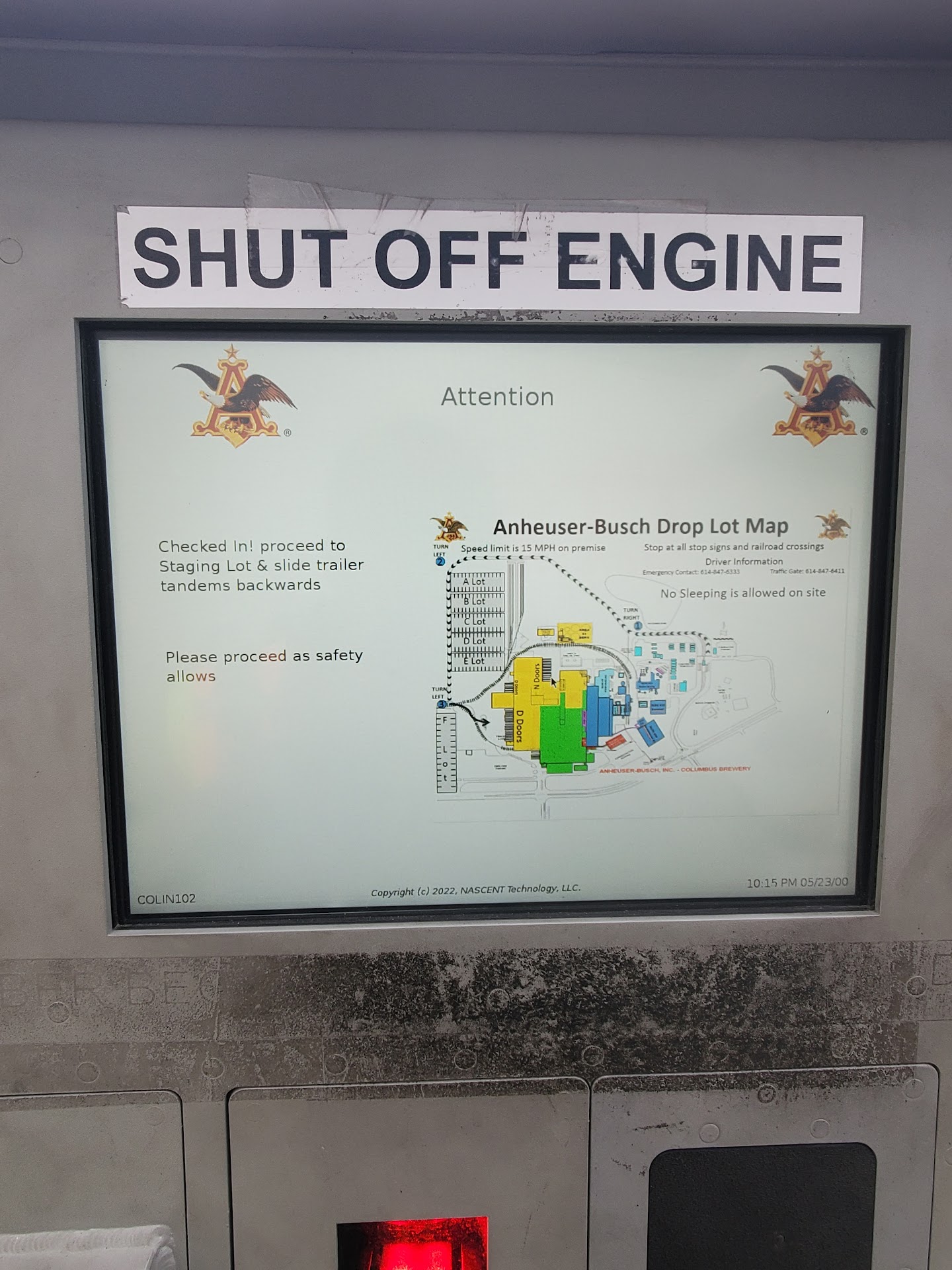 After which I pulled up to the security shack to check in at the terminal outside. The terminal will at some point ask you for your delivery #, if you can't find it than security will prompt you to walk inside with your BOL's and they will point it out for you. Once you complete check in security will tell you to close your doors. After that you'll see a map pop up on the terminal telling you where to go. It'd be a good idea to take a cell phone pic of this map.