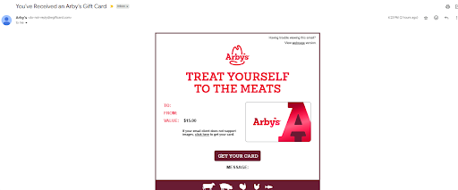 On Friday, August 8th, I received a $15 Arbyâs e-gift card (with QR code, gift card number, and PIN) intending to order online as I always do and use Arbyâs promotions. The website had NO PLACE to enter the gift card. After searching, I called the Midlandâs Commons Arbyâsâspent about 10 minutes speaking with a male employee who was uninformed and even mentioned DoorDash, which I hadnât brought up at all. He then spoke to a manager but still couldnât give me answers on how to redeem a gift card online.