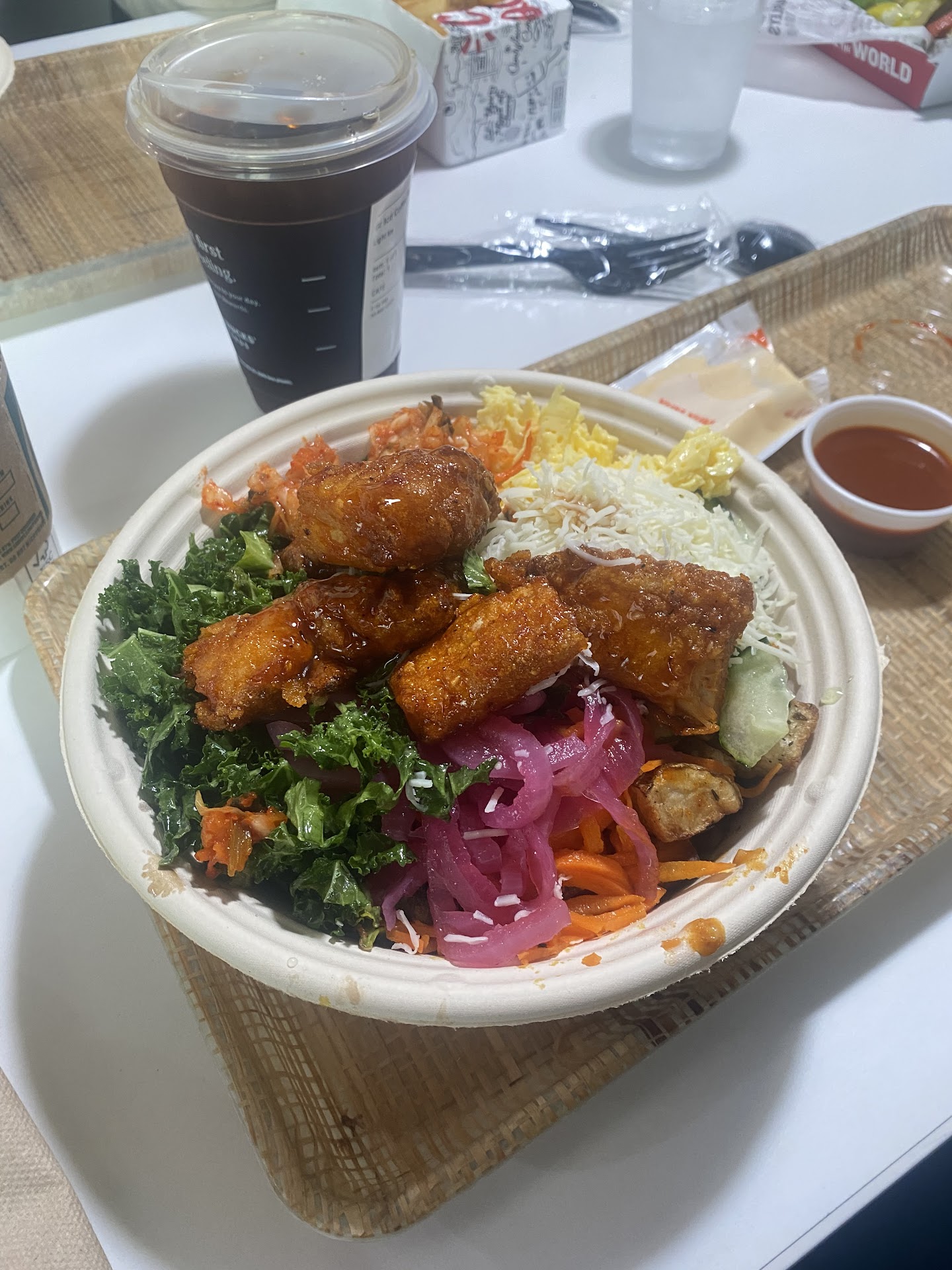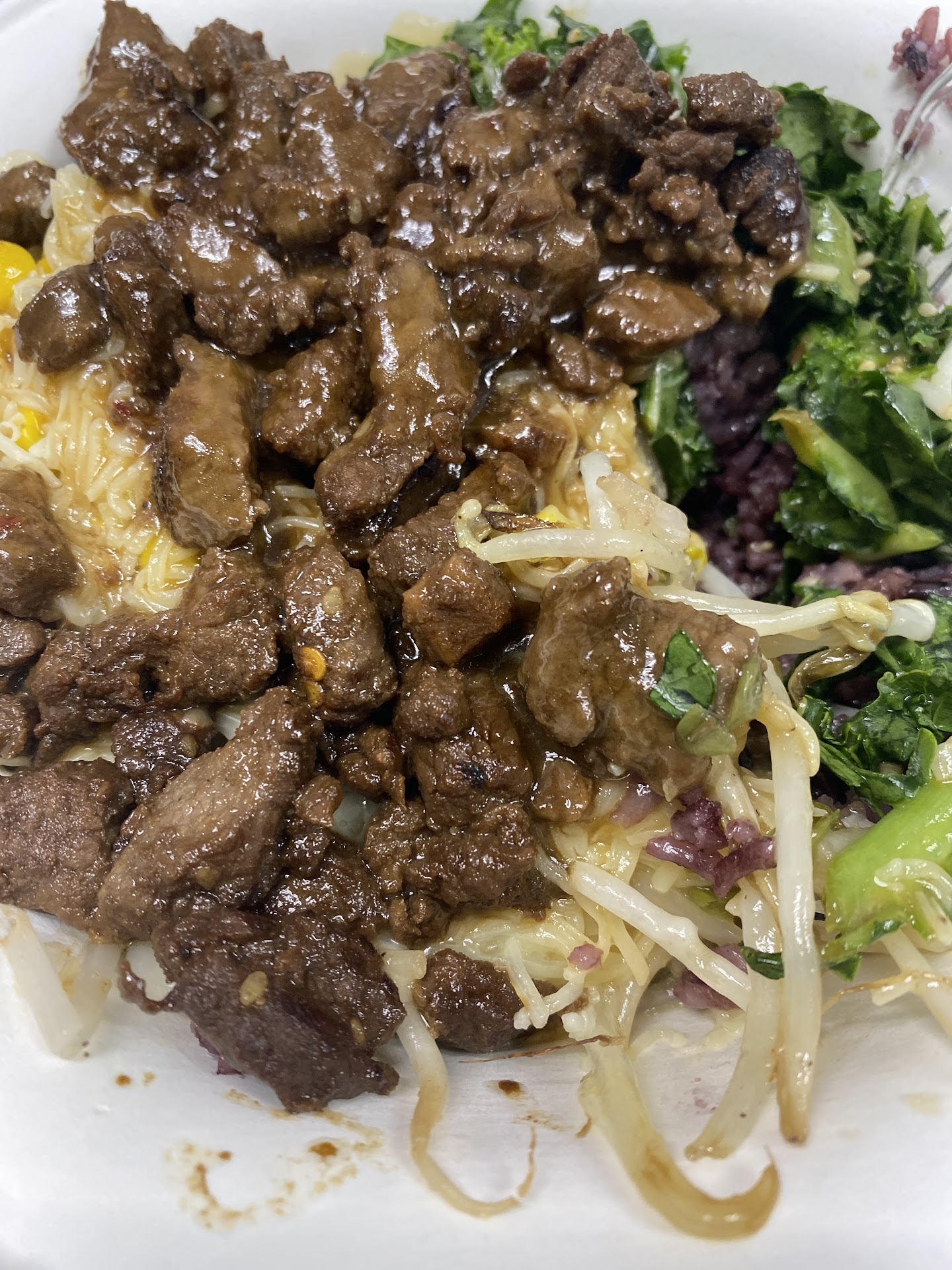 Read moreDefinitely worth a second look. It's pretty overwhelming the moment you step in on your first time. They have purple rice! So I ask myself what should purple rice taste like? The guy in front of me got it so maybe I should to, I do. Also, potatoes on my Asian food? What is this, America? Then you get to the meats, chicken, spicy chicken steak or something that looks like mean but is in fact a veggie. It's Asian so is it really spicy, hard to say. I chickened out, in other words I got steak. Then on to veggies, most of them are pretty normal then there's unidentified yellow stuff and unidentified white stuff, I listened carefully to the guy in front of me to see what he ordered, no help there he stayed pretty safe getting only identifiable items. I braved it, "give me a little of everything." Next sauce, yum, yum, ginger, Sriracha, hot Korean?, And teriyaki. I panicked and got yum yum and ginger, the lady looked at me like I was crazy, whatever lady, you guys have potatoes for Asian food, who is actually crazy here? Then you pay. I should have gotten the sauce on the side but you live and learn. Overall the food was good. The veggies were fresh, the steak was on par with other chains, the sauces were good, yes I even liked the purple rice. It's going to take A few times to figure out what flavors work well together and which don't. I'd definitely go back...