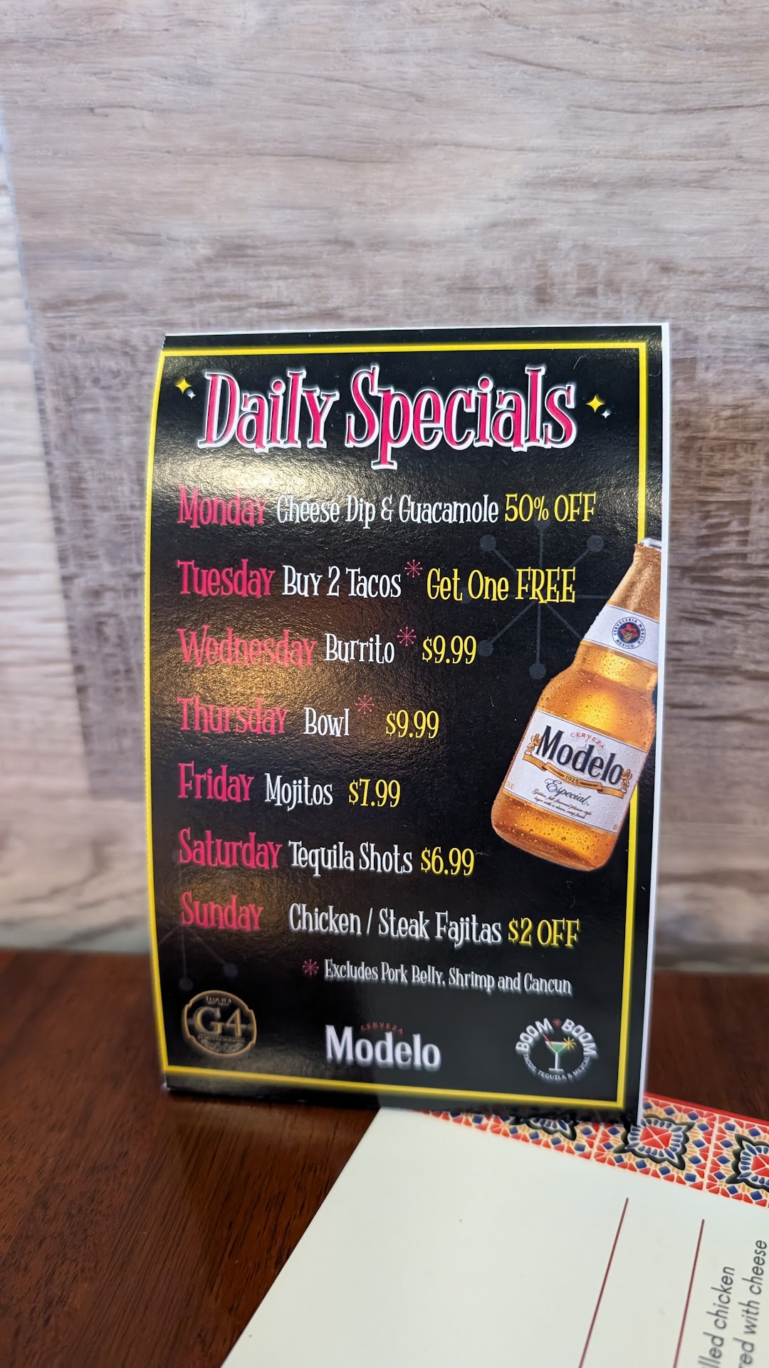 We were at it again. Another new spot. We love finding new spots. So, Boom Boom, well, they do serve what is in their name. The wife had the Quesadilla (Steak), and I had the Fajitas (chicken). The aroma from the food got there before the waiter/bar tender with the food did. Now the pics were taken after we had already started to eat, but we were hungry, and the aroma was so good we dug in. The taste of the food you could taste all of the spices and the flavor of all of the food on the sizzling skillet. Yes, the Fajita skillet was so hot. It sizzled a good 6 to 7 minutes after I got it. It was so delicious and so flavourful. The wife said that her Quesadilla was also so flavourful. They bring you chips and salsa when they seat you. We also ordered a pitcher of watermelon Margherit, and that was also made very well. They have about or maybe every type and brand of Tequila that is made. They also have a lot of Mezcals too. We are going to go back and sample some of the Mezcals. We sat at the bar, they had 8 or 10 booths and about 10 or 12 spots at the bar, the bar tender served us, and he was very friendly and attentive to everything. Very knowledgeable about all of the different tequilas they have. So if you like Mexican food, make this a stop for yourself. We will become regulars here. The bill for both of us and drinks were only 58.00 plus tip....