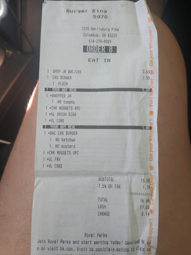 Read moreThis is hands down the WORST fast-food restaurant in Columbus. I have never been through to get food and NOT had them totally screw up my order over the last two years. Today, was no exception. Did not ring my order in correctly and could not give me a receipt of my transaction. Even, the district Manager could not figure it out, go figure! This is who is teaching the revolving door of GM's (brand new GM, currently). What this store is great at? They specialize in, making excuses and defending there employees who screw up the orders. Today, I now know why this restaurant is so HORRiBLE. After talking to the district manager, he was also an expert in excuses, even though they are the ones that can not get an order right. Just overall a horrible experience, over and over again. Also, an embarrassment to the Burger King name. I promise you, I will never eat at this poorly run, from top down, establishment again. How can they screw up so many orders? Read the reviews. This is over...