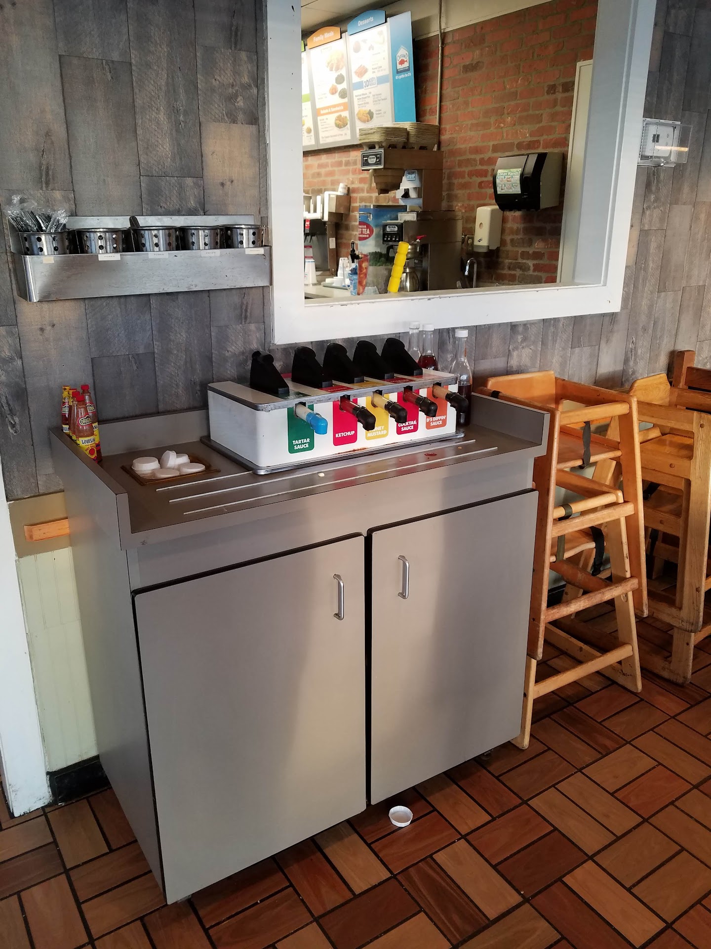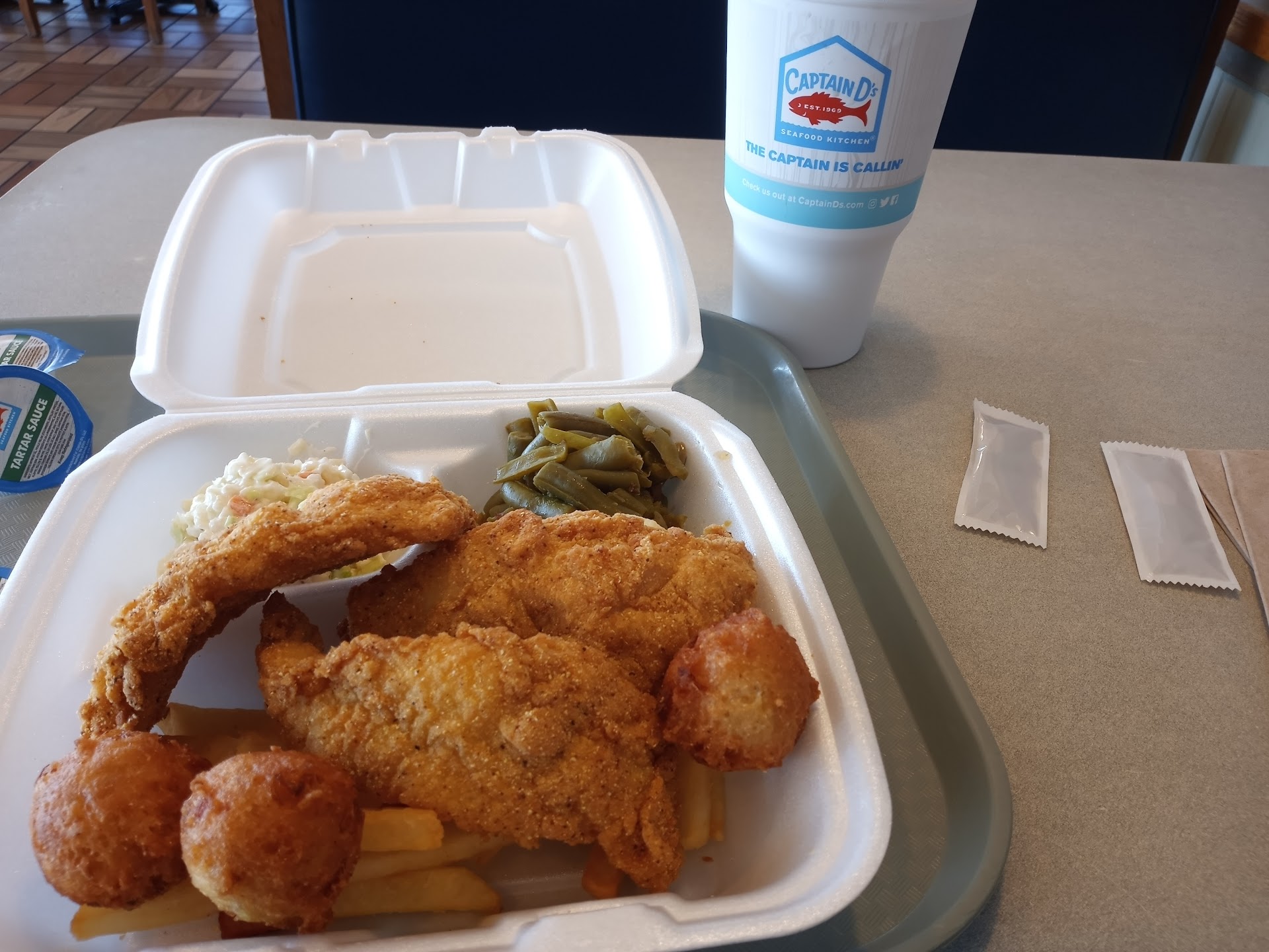 Read moreFor fast food seafood their food is pretty good. I went through the drive through and the service was pretty quick , it took about 12-14 minutes to get my food. The lady at the window only spoke to me to 1. Tell me the amount and get card 2. To ask me if I wanted any sauces. I said yes she puts it in the bag and kind of shoves it at me and I tell her thank you and I hope you have a blessed day, because she looked like she was mad at the world, no smile nothing, God bless her heart, then she slammed that window in my face! Well at least I can tell y'all, for fast food it was pretty good. I ordered the grilled fish with green beans & mac 'n' cheese, and let me tell ya'll their mac "n" cheese is pretty darn good to be fast food! It's good and cheesy, and the fish was really good, it was cooked just right! And of course you get that one breadstick and it was delicious, I love those things! I wish they sold them by the dozen! All in all y'all I give...