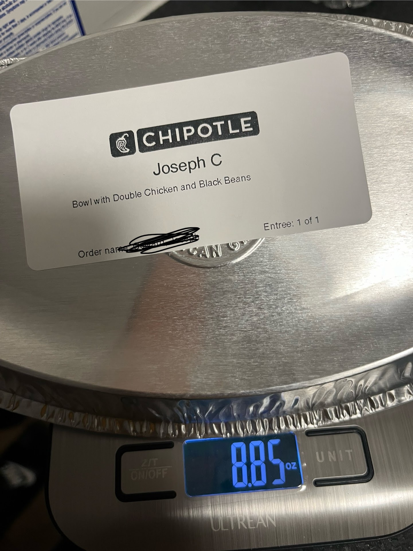 I try to track my macronutrients but this lack of standard leaves me guessing sometimes. The website’s nutrition menu makes it apparent that each serving is one 4oz scoop of food. A chicken bowl should have 4oz of chicken. A double should have 8oz. I do not like ordering a double chicken bowl online just for the bowl to barely have 8oz of food in it when also counting if I have beans or rice in it. The bowl pictured should have around 12oz of food in it (8 oz of chicken and 4 oz of beans). It barely broke 8oz with the lid. What is missing and how much? These macronutrients matter.