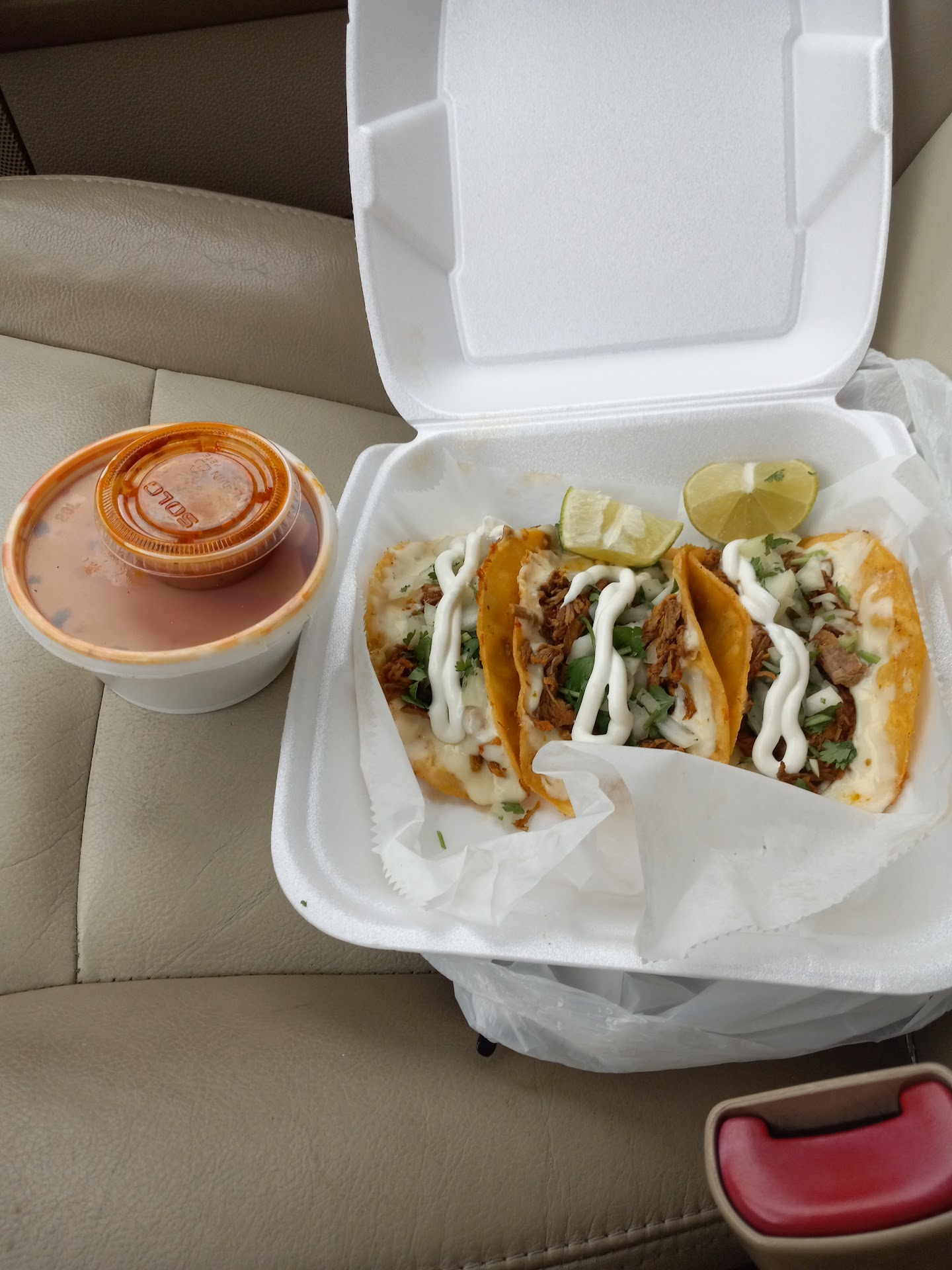 Read moreMy daughter wanted horchata, I drove by this place last week and saw they sold it so i stopped by. Two people in front of me both for delivery service orders(grub hub, uber eat). Got here at 545p order taken at 617p due to them fulfilling delivery service orders first and making every one else wait. I asked for horchata, they don't have any(if I knew they didn't have what I initially came for I would not have waited in line 32 minutes, why didn't they just cross it off there sign?) I order birria tacos and elote she say 15, I come back in 17 she say 5 more minutes, I get my food at 642p. The elote was subpar at best and no consomé comes with their birria tacos you have to order that separately fyi. I've never ordered birria and the consomé did not come with. This part may be nitpicky but after nearly an hour of waiting idc but they did not put any napkins in bag I guess they figured I didn't need them since they didn't give me any consomé. The actual barria tacos were cool a solid 3/5. I'll try them again in 3 months to see if they got better with handling orders, I believe they are new to this. Anyway there's another taco truck next to there's I usually go to anyway and will...