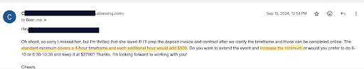 A few months before the event, Christen left the business and we began working with 2 new staff members. Communication was slower, and we were still confirming final details the day before the event, but most things had already been settled. We asked to enter the space earlier than 4 PM—first 3 PM (we were told “happy for you to come in at 3 with no additional charge”) and then 1 PM (response: “Sure, your aunt can come in any time between 1PM and 3PM”). This was consistent with what we’d been told during the initial tour: if no other event was scheduled, access would be flexible. (Screenshots.)