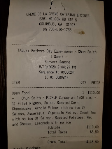 Read moreFirst of all... never again. I been waiting to do this review to get my thoughts together because I just can't believe it. The fact that she charged so much is why I expected so much from them. I ordered from here for father's day. Let's talk about the flavor. It was a very boring meal. The salmon had no flavor. The mac and cheese tasted like stroffers which isn't bad but you not going to pay a whole lot for it. The portions are small. This was for father's day. Men can eat ALOT. For all that money, I was expecting generous amounts of food. My mother says the mignon had no taste either. My mother loves dessert and threw the cheesecake away. That blew my mind because she never waste sweets. I should have never paid that much money for a meal I could have gotten at any regular old chain restaurant and it would have tasted better. Even the tea and lemonade tasted bad. 1 star is too...