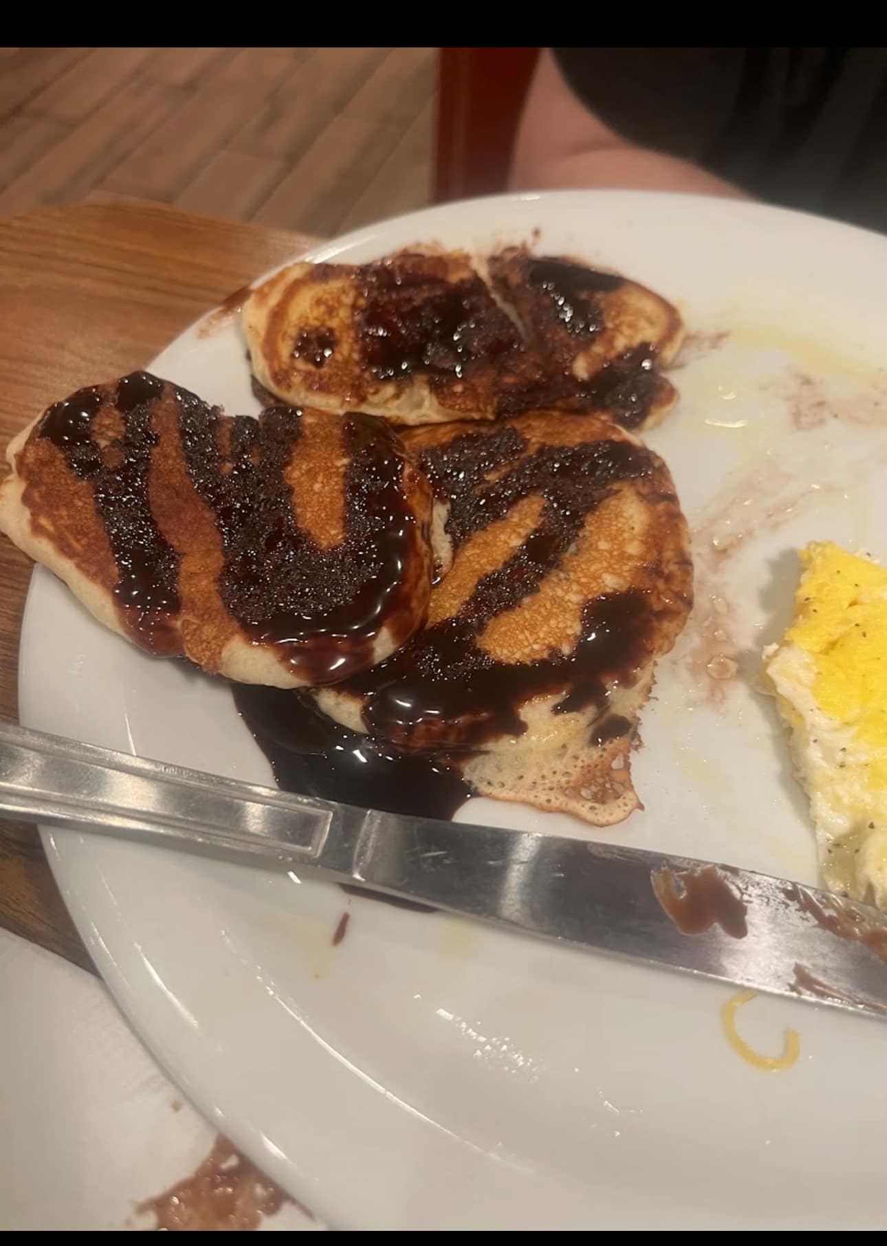 Came here tonight after the Reba concert… I was with a large party and it took 15+ mins to get our drinks. Then they forgot one of our milkshakes till much later. Our order didn’t get placed till at least 5-10 mins after our server took our order - We placed our order, we all ordered stuff that was quite easy- all breakfast. It took almost an hour for that to come out. Then they forgot two of our meals! We didn’t get a drink with our meal we asked for to be brought out with our food. None of our food was what we ordered. I ordered an omelet with Cheese, chorizo, and mushrooms. I got sliced cheese - not even melted, breakfast sausage, and cold canned mushrooms with some juices inside of the omelet. We asked for well done hash browns and they came out white.. we asked for sourdough toast- we got white toast that was barely toasted and no butter. The pancakes had burnt chunks of we would rather not know what it was. The one pictured had something white in all of them right in the center - We finally just gave up on this place and asked for all of it but one meal to be taken off and our drinks.