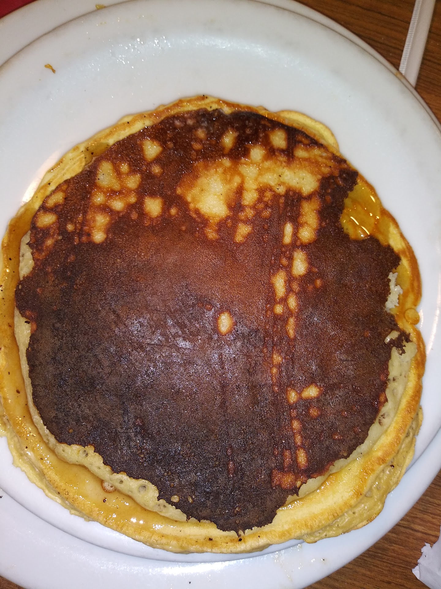 When the food arrived we were once again disappointed as nothing was quite the way it should have been. We all ordered the Super Slam (2 eggs, 2 pancakes, 2 sausages, 2 bacon, and hashbrowns) but it was not good at all, my sausages were cold, scrambled eggs were runny, pancakes were burnt and crispy (how do pancakes end up crispy?); my wife was eating her pancakes when she noticed that there was chocolate on her plate, we hope it was just left over chocolate from the griddle and not from the plate.