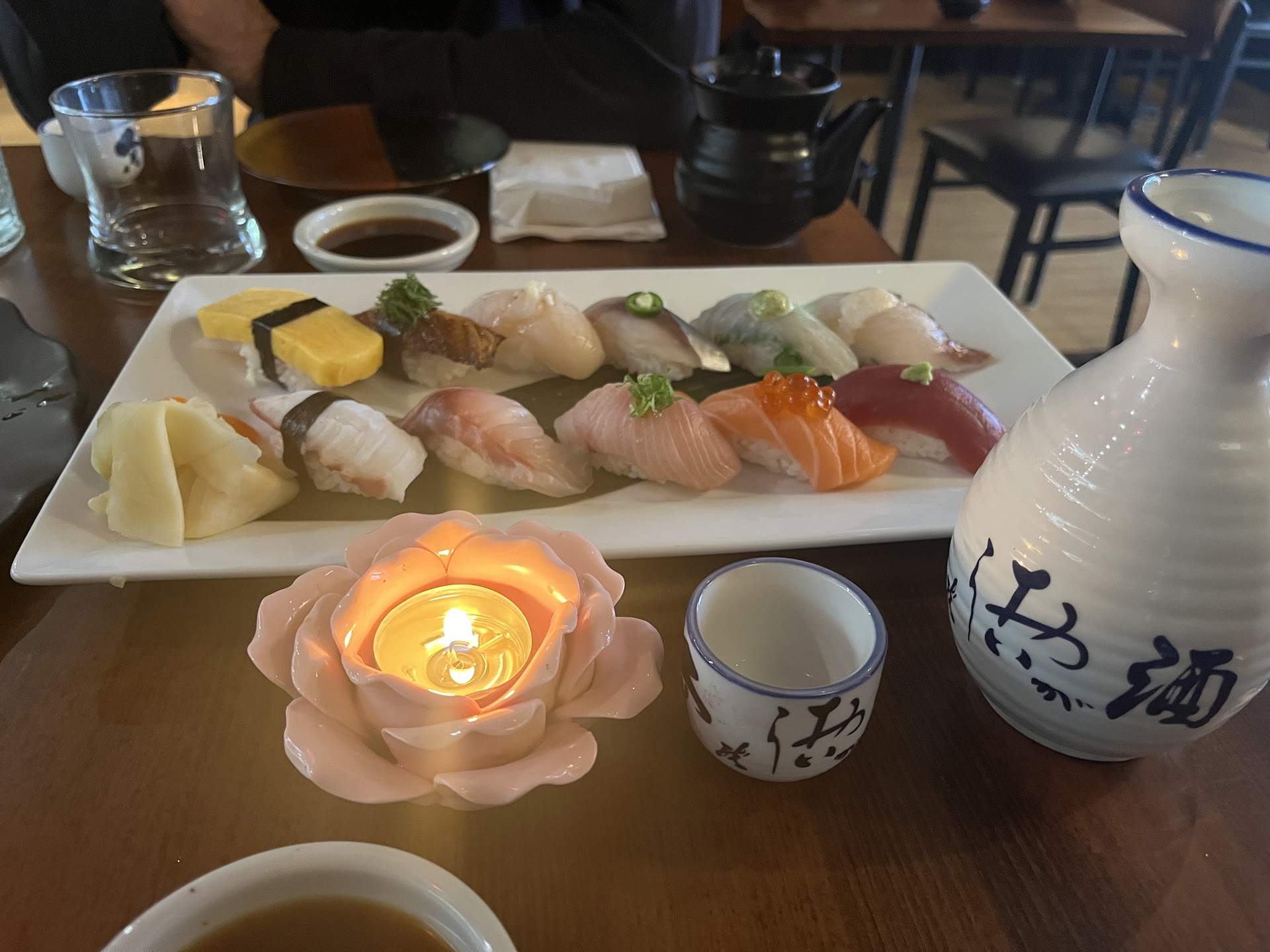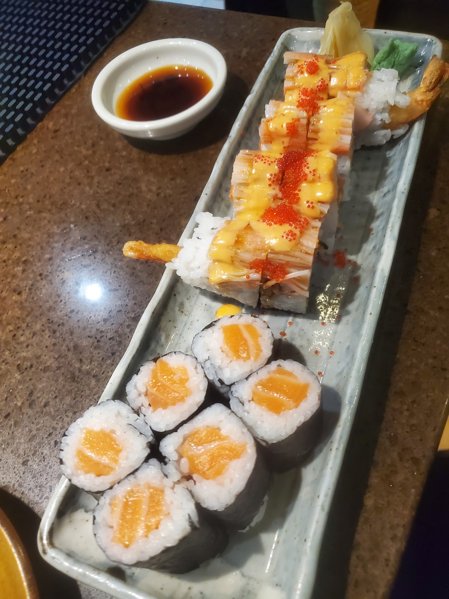 The sushi rice was pleasantly vinegary but also sweet, but not too much. My salmon roll wasn't closed all the way properly-- but I wasn't mad because it was due to the large piece of salmon I got, soft yet firm, fatty and melty and tasty with soy sauce. My red dragon roll was wonderfully spicy thanks to the spicy tuna, but the flavors of the shrimp tempura drifted through and the crunch and pop of tobiko were perfect. There was a light delicate sweetness from the imitation crab on top. Happy hour prices made this a very affordable sushi dinner. Excluding my drink, my two rolls were about $16 in total.
