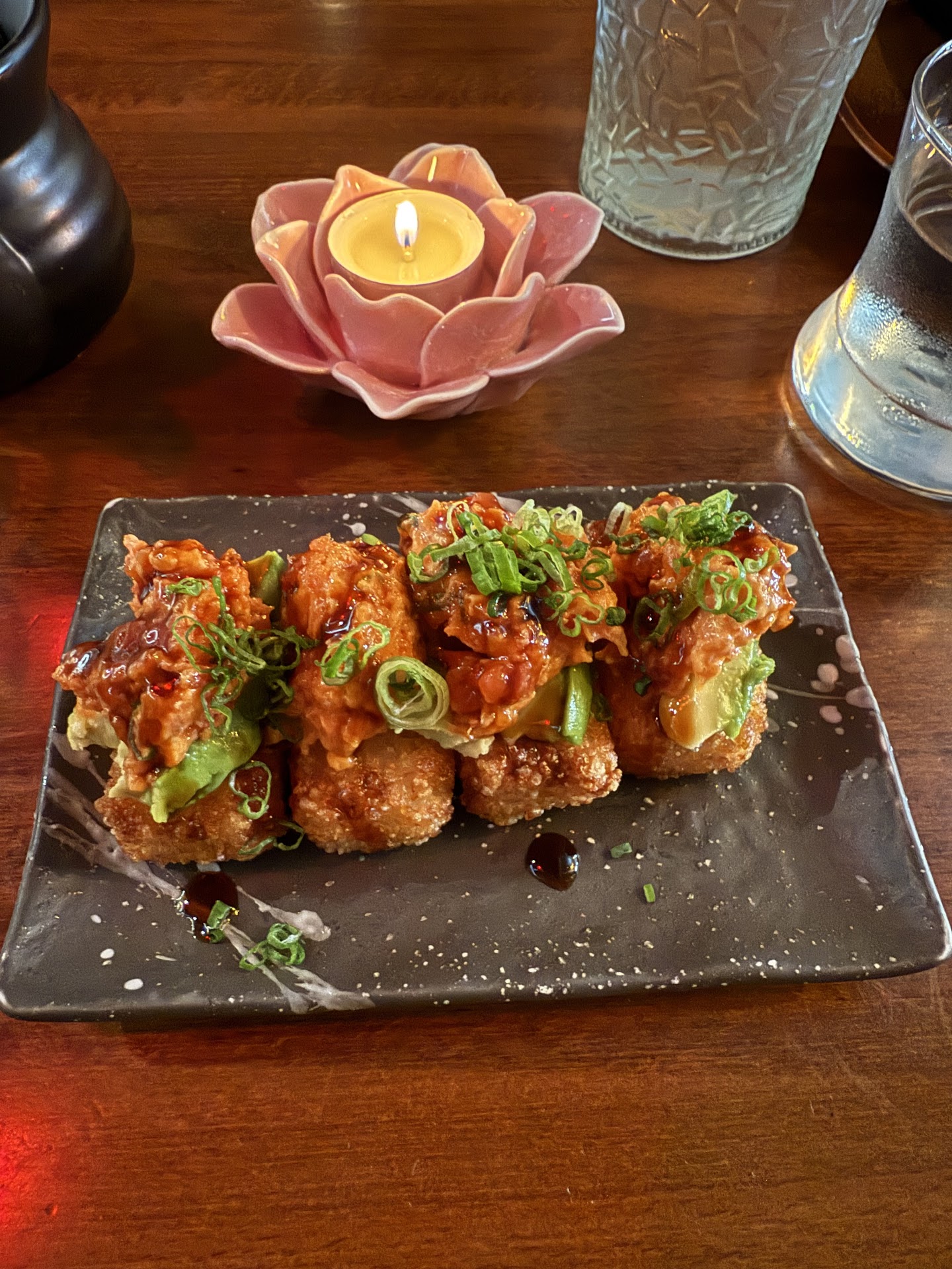 We also ordered four sushi rolls off the happy hour menu: California, Philly, spicy tuna, and a specialty roll (the name escapes me). They were good, fresh, and well-prepared—but compared to those appetizers, they felt more like a bonus than a highlight.