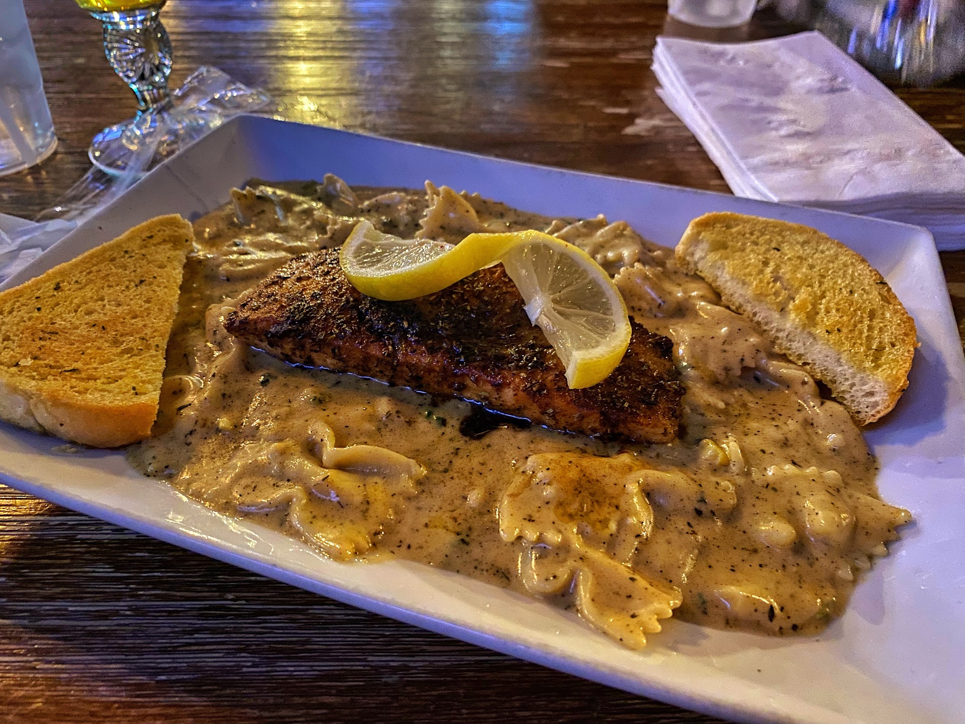 After some consideration, I decided to try the blackened salmon pasta while my friend opted for the chicken Alfredo. Both dishes were expertly prepared and tasted absolutely delicious. The blackened salmon was perfectly cooked and had just the right amount of spice, while the creamy Alfredo sauce on my friend's dish was rich and flavorful. We were both impressed with the quality and presentation of our meals, and we savored every last bite.