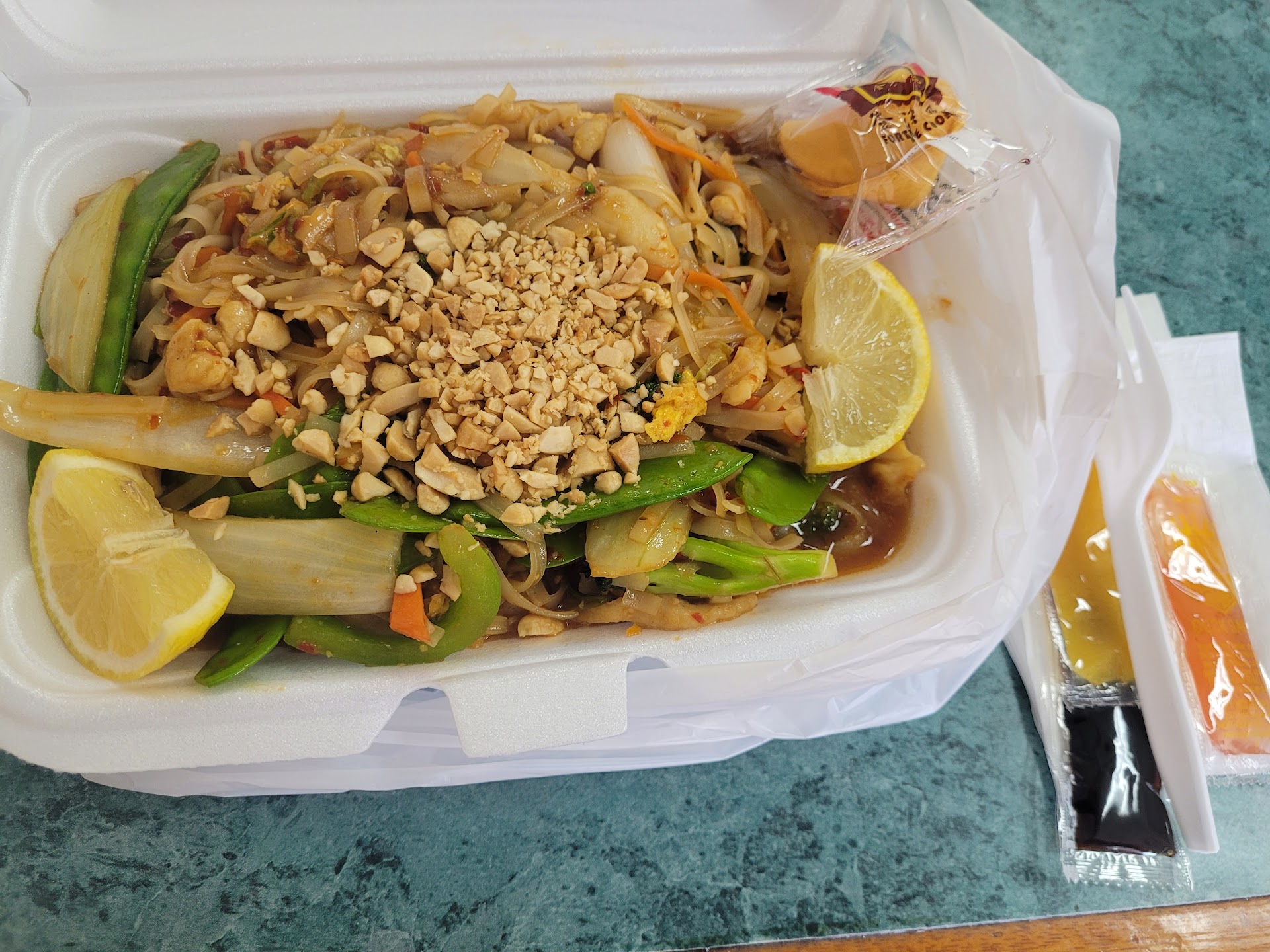 We ordered & actually got our food really fast. I couldn't believe how heavy the bag was. Needless to say that they definitely give you good size portions. My only complaint is that I love sweet & sour chicken, but it didn't come with any vegetables. It just doesn't taste like real sweet & sour chicken without all the veggies & pineapple. Everything else we got was...