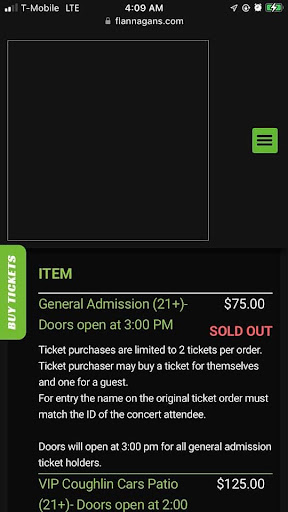 Read moreI know people who are sponsors for this business and are sponsoring the Morgan wallen event. They came to me yesterday and said that the show was sold out already to all sponsors, family, employees, and friends. The event was sold out 24 hours before the event was live to the public and they were still advertising it during that time after. The sponsors I know recieved many codes to put in to get the tickets 24 hours before the tickets went on sale. This is bad business and will never support these people and neither should any sponsors or other people. The sponsors also told me that flannagans also intentionally shut down the website so that they can just act like it was up and sold out in minutes. This was the whole plan all along and now that they are receiving back lash they are having people who they gave tickets to, to leave a 5 star review to keep their tickets....