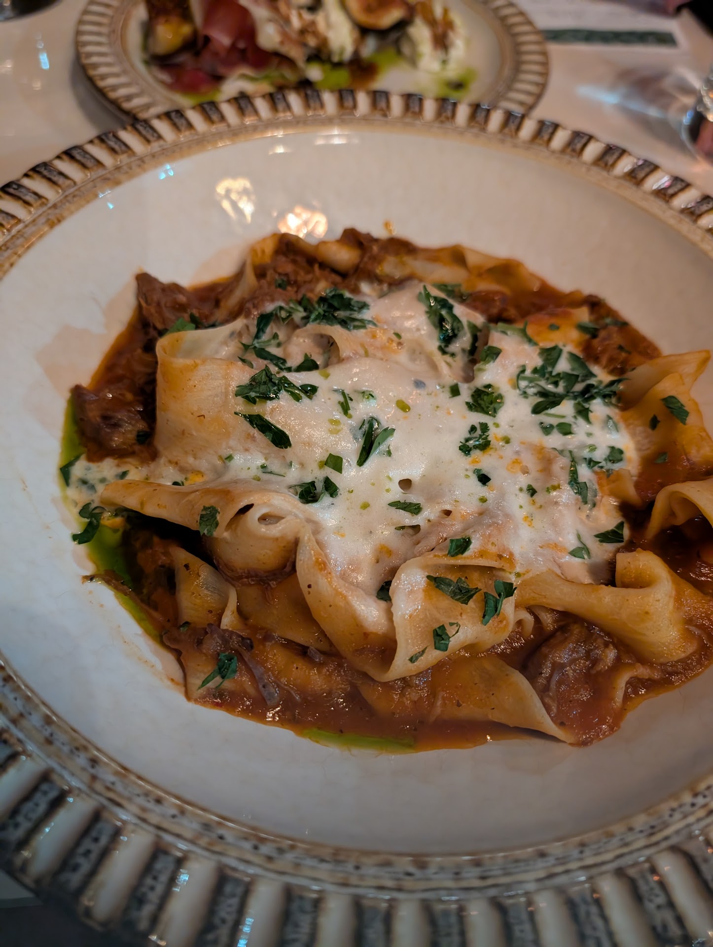 I absolutely LOVED it here. My boyfriend and I came here for dinner a few nights ago and it was such a good date night experience. Our server Maddie was amazing and very attentive! She was very patient with my indecisiveness and was also very kind. I tried both of the bread options, the arugula salad, and the miso brown butter and mushroom noodles. The bread was so fluffy and both of them tasted great (my personal favorite was the truffle honey bread). I also had the arugula salad, I'm normally not the biggest salad person but the dressing and frozen raspberries definitely added so much to the salad to make it a perfect blend of flavor! The miso brown butter and mushroom noodles were also fantastic and I would definitely recommend them to anyone dining here. My boyfriend had the butter chicken alla vodka which he loved as well. I am not the biggest spice person and I would say that the butter chicken does have a bit of a kick, but he loves spicy food so he really enjoyed it. The caramelized peaches with burrata and prosciutto was an amazing combination that I didn't even know existed until I came here. It was probably one of the best dishes of the night in my opinion simply because of how well it all fits together and tastes. For dessert, Maddie recommended I try the ice cream mudd pie. This was ABSOLUTELY the correct choice. While I'm sure the rest of their dessert options are just as good, but the oreo mixed in with this decadent dessert was heavenly. Overall, I absolutely loved my experience here and will 1000% be...
