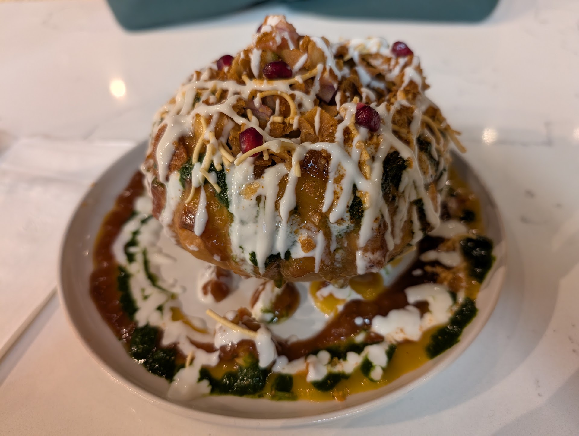 My partner and I went to Food Street for dinner tonight intending to eat in. When we arrived around 8pm all of the tables were full with many people waiting around for tables so we decided to order to go and eat at home. We ordered Gappy Chaat, Golden Gappy, a mango lassi and a mango mojito. These turned out to be a bad choice for take out but we did not know this at that time since we have never tried these things before.