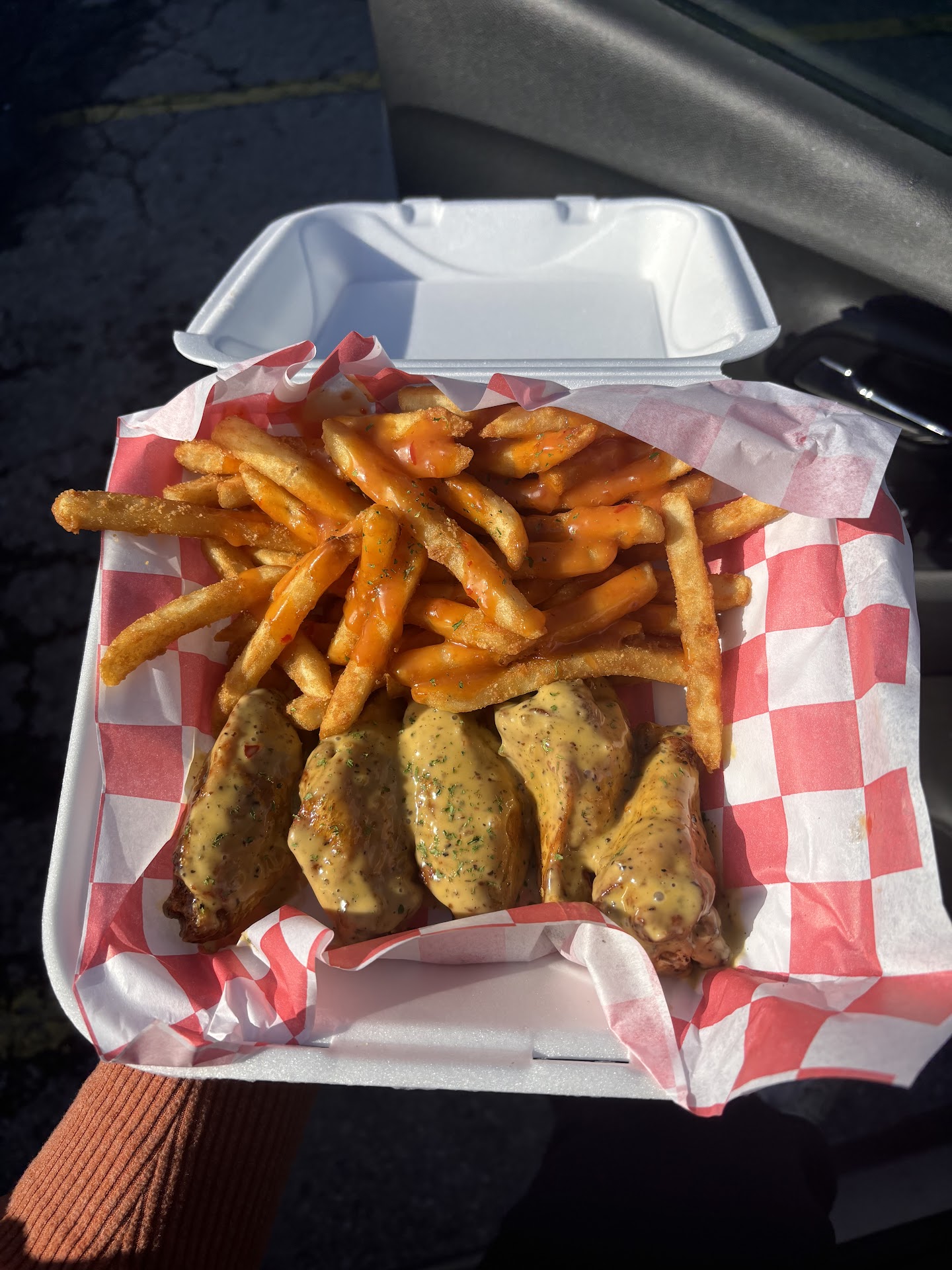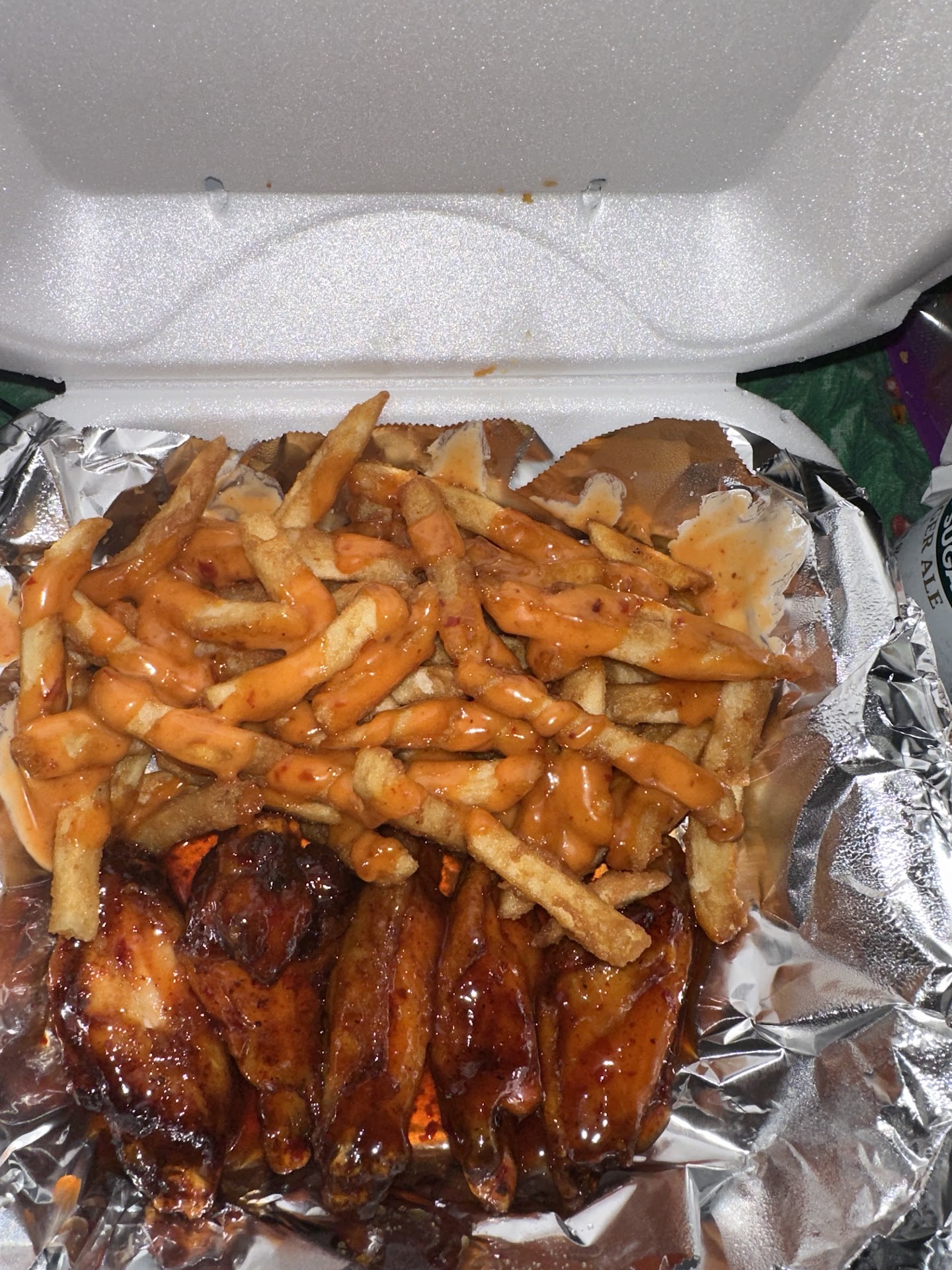 Wings seem to be oven roasted/baked. They are tender and fall off the bone. Fries are topped with a delicious sauce called bam bam.