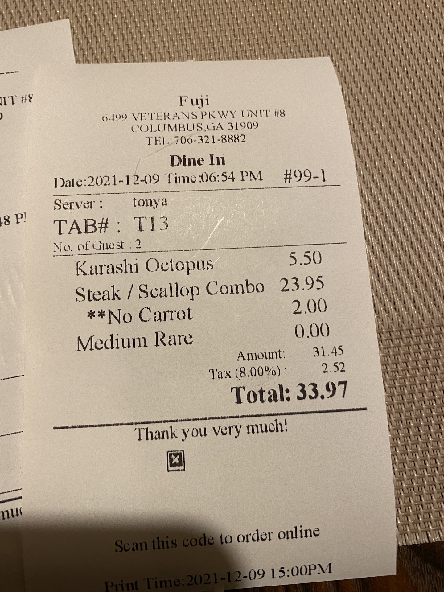 Read moreROACHES!!! NEVER EVER AGAIN!!! - If you CONTINUE to SERVE FOOD to the public KNOWING you have ROACHES, YOU ARE DEAD WRONG!!!! EVERYTHING is NOT about MAKING A DIME when it could potentially harm others, making them sick. Went in the day before Christmas during lunch around 1pm EST. All was well until we paid over $70 and gave over 20% for a tip… A HUGE ROACH crawled out of nowhere by the grill into one of the black cloth napkins. After telling them, the manager (I assume) with maroon hair came over and killed it with a black cloth napkin (that will still probably be used) with her bare hands!!! She said they had just had an exterminator out the day before and it probably caused roaches to roam. WHAT!!! She barely even offered an apology, except “I’m sorry for that” not to mention any form of compensation. To keep from causing a scene (no one was at the hostess stand) going out, scaring other patrons off, I tried to call back. No one ever answered. This is totally unacceptable after bearing through eating crunchy rice because off eggshell being left in the rice. I WILL be informing SOMEONE!!! After looking at some of the latest reviews and seeing them respond redundantly with sorry, email us, we want to hear more - I’m almost sure they don’t care about what I feel or hearing what I have to say nor will anything be done about it. This is the second time eating out in Columbus that I’ve seen roaches. A few months ago, the IHOP by Texas Roadhouse had the same issue. I’m so over it! I’m not sure when the health department comes through, but these two establishments DEFINITELY need to be seen. I kept my receipt in case they tried to say this review was fake, not to mention cameras don’t lie. The young man serving with curly orangish-blond crinkly hair was kind. The chef was nice, but older… He left eggshell in the rice so everything was crunchy. Order - 2 steak/shrimp, 2 chicken all double rice...