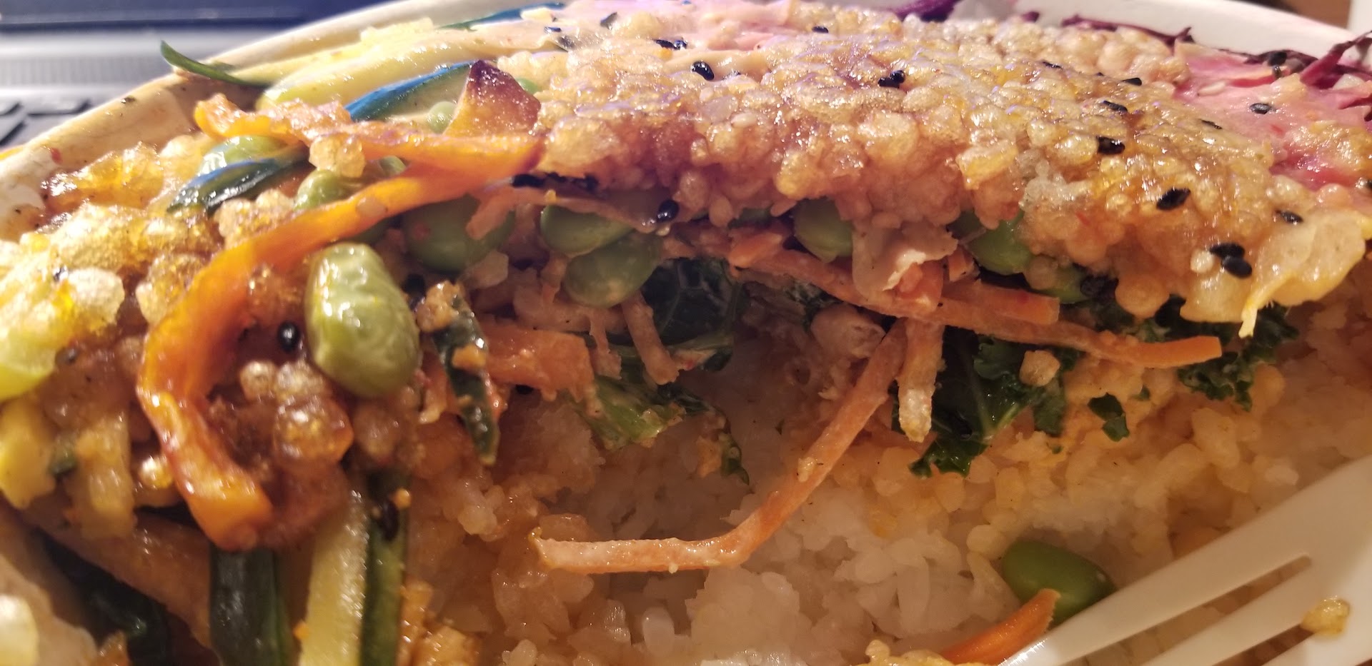 I had looked at the FUSIAN Grandview menu on-line -- in advance of my visit -- and had decided that I would order the following "Signature Bowl": Chicken and Rice Bowl [roasted chicken, cucumber, sweet pepper, carrot, tossed with creamy togarashi and house dressing; served over white rice with scallions, tempura crunch, and sesame seeds].