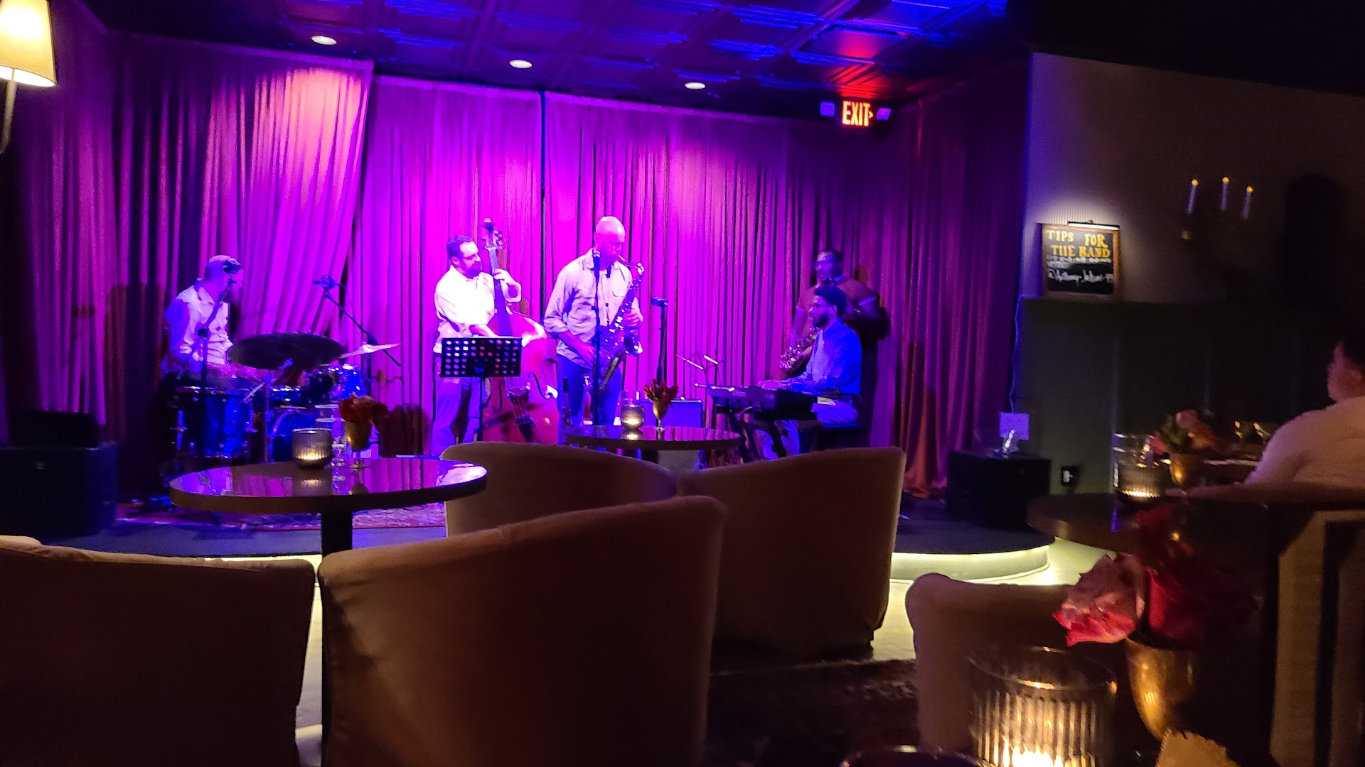Went for the first time to celebrate my birthday. I had trouble making an online reservation (not necessarily their fault, I think my cruddy laptop was glitching) so I emailed them. Patrick reserved a table for me with a wonderful view. These intimate tables for two that are closer to the stage have the most comfortable, plush chairs - the kind where the back wraps all the way around the seat and you're enveloped. There are stools at the bar, and the wall seating was a bench that probably went all the way across, but also had plush cushioning and some curtains for segmentation and ambiance. Bathrooms are easily accessible and close enough you can still hear the music. Waitstaff buzz about to appease the audience, but somehow never distract from the show.