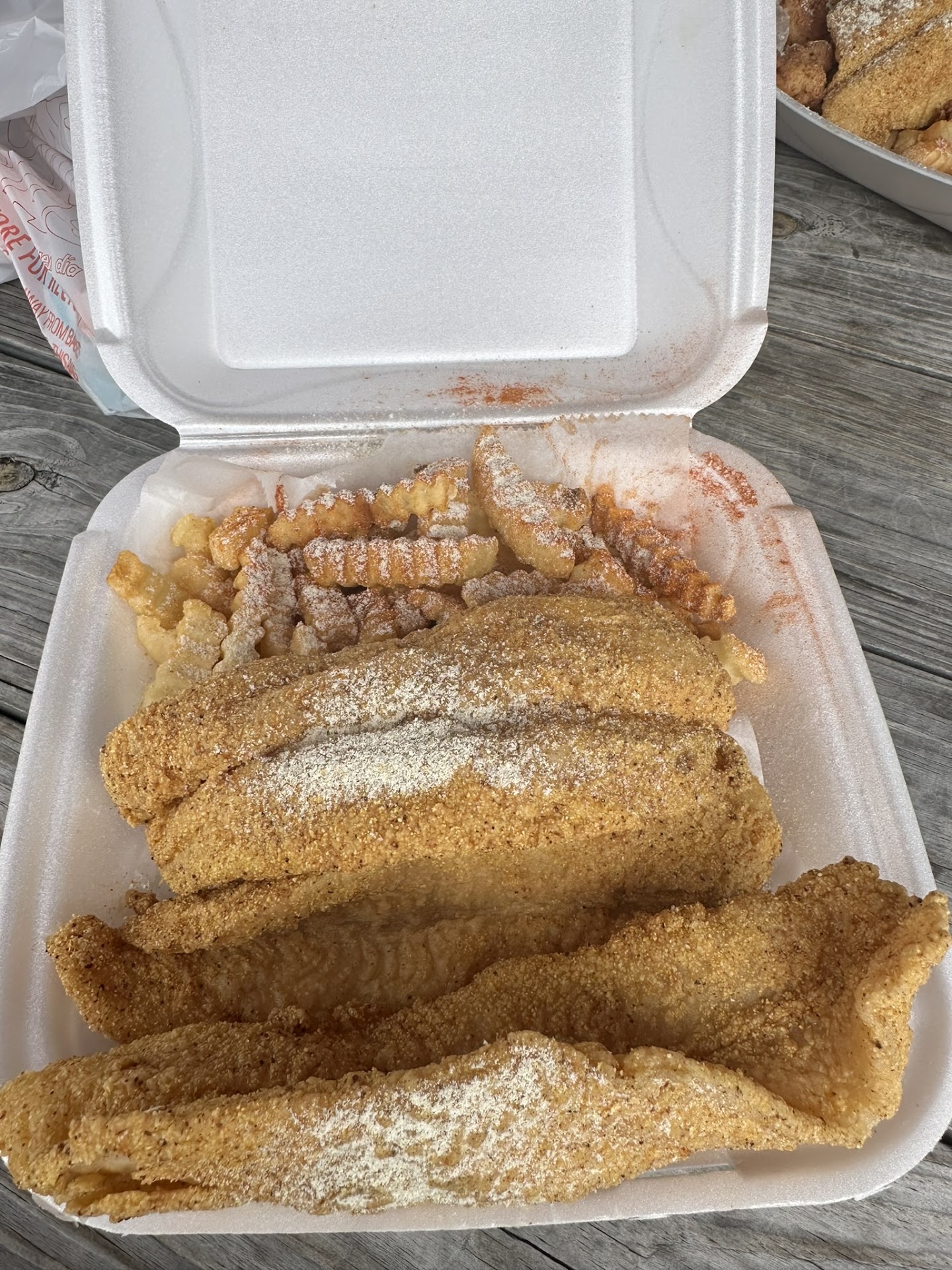 I ordered the catfish 15 piece meal with fries well done. Added slaw and banana pudding. Which I will pass on the next go around. The taste of the slaw was fine just needed a bit of pepper however a little to runny for my liking. As I have a texture issue. The pudding is just instant which again some may be coo with however not at 3.99 for me. 3.99 homemade with some sliced banana to top with vanilla wafers yes you can have my 4.00