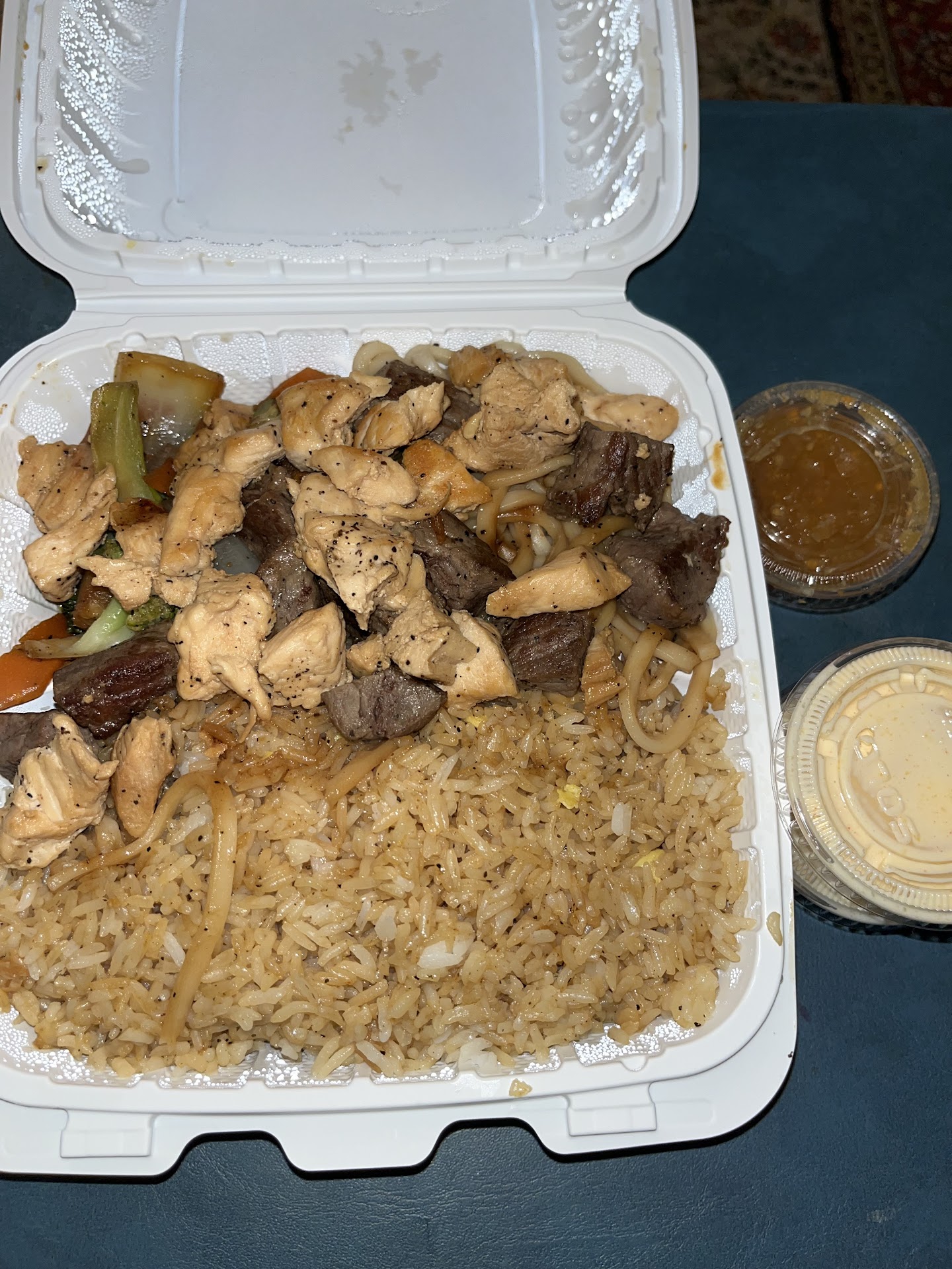 Read moreI should have known from how empty the parking lot was that this food was not it. It sits in the old golden donut spot which they still do sell donuts not a lot of them service was great I was immediately greeted food came out quick and fast probably spent less than 10 minutes in there I ordered chicken and steak hibachi that comes with soup the soup was very flavorful it was hot and peppery I enjoyed it. I asked for rice with my meal and I got lo mein and rice and when I tell you the food had no seasoning and the rice you can't even call it fried rice because you can still see that it's white whatever type of soy sauce they was using had a very sour taste to it like a lemon with barely any salt and pepper to it The yum yum sauce is very watery it's really sweet an tastes like you're drinking sugar water this will be my first and last time here what a waste of money I absolutely love the decor because I like the nostalgia I like seeing the old vinyl record covers pasted all over the walls some of them I have never seen the covers before or the artist so I got a kick out of Google searching...