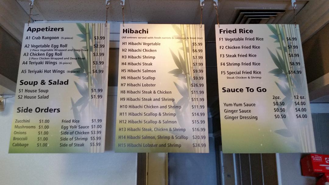 9/2018 If you've ate at this place 2 and 3 years ago in 2018 it is not the same place their menu is reduced they've gotten rid of the sushi even though it still says it on the door and you see pictures here they no longer serve sushi and it's been like that for nearly a year. They also don't have fried chicken that's been like that for almost a year they've taken some things off of the menu and they reduce the sizes of your food but the prices the same I'm done with them. I just went September 21st 2018 I ordered the shrimp hibachi with no rice the shrimp was smaller than what it used to be a year or two ago it was burnt the flavor was off and all I got was cabbage so I pretty much shrimp and cabbage they didn't even mix any other...