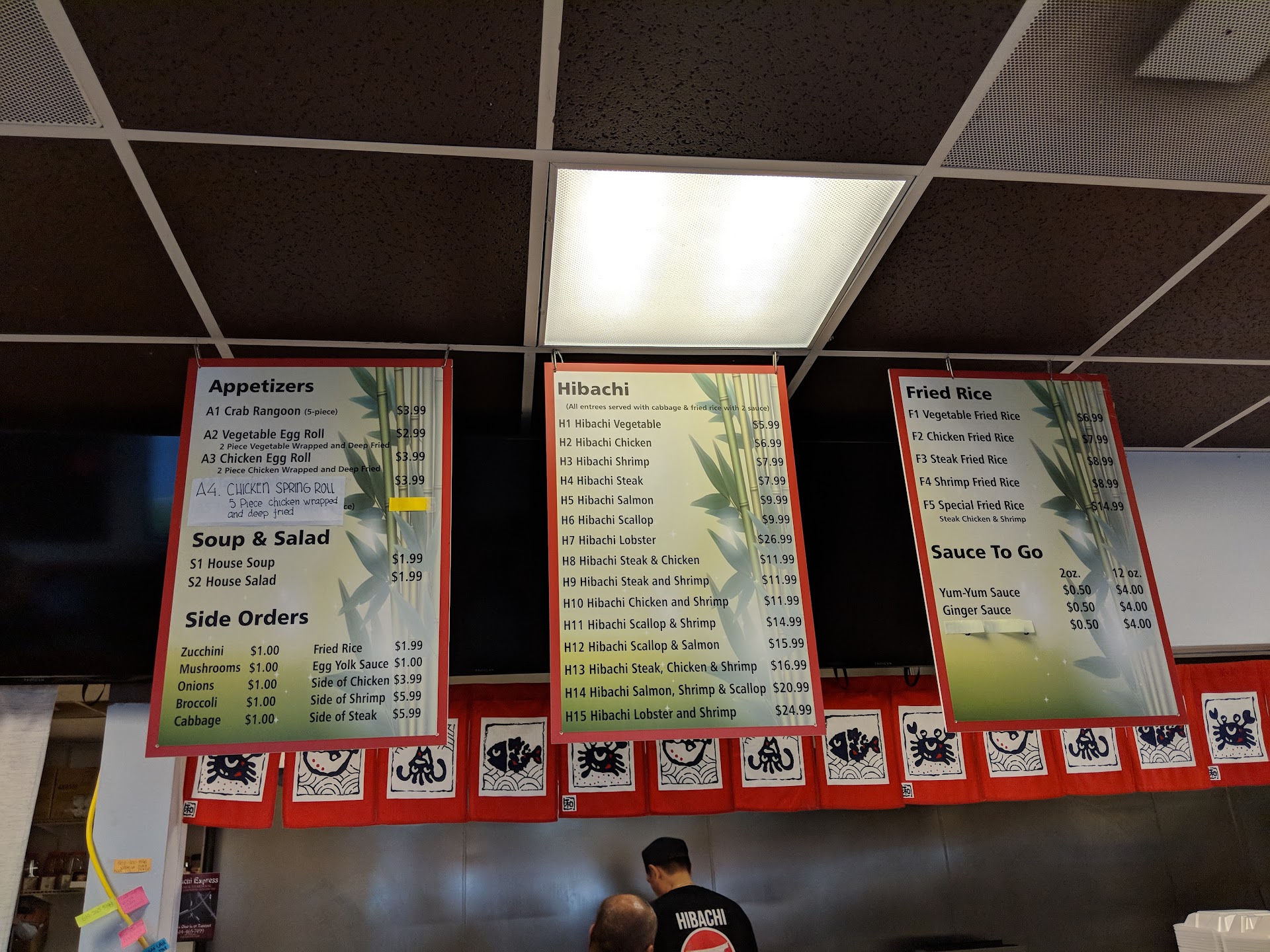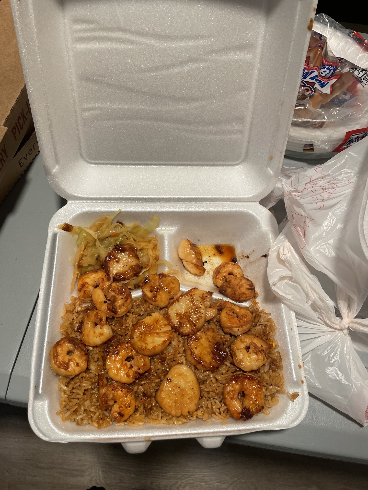 Read moreWhile prices are comparable to other hibachi style express food shops I was a bit disappointed. You can not get a "hibachi" portion without vegetables, instead they upcharge you a dollar more and just load you up with more rice. This completely throws the rice to meat ratio off and you are left with what amounts to about half of a diced chicken breast, or about 7 pieces of shimp, to 2-3 cups of cooked rice. (I did not try the steak or any vegetables) The yum yum sauce is also just "ok." It lacks any distinct flavor profile and the two, two ounces cup aren't enough to coat the rice, let alone the meat as well. The food itself was also just "ok." The meat was dry, both chicken and shrimp, but the rice was good even though it was only moderately warm. When asked if they could mix the meat and rice and have it cooked together to get the rice hot they advised that they do not mix them and that it is the customers job.