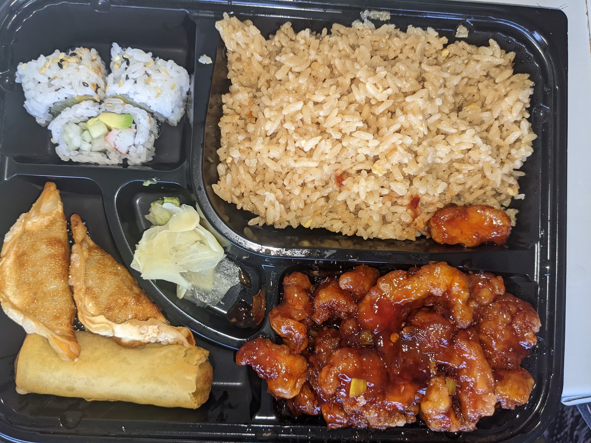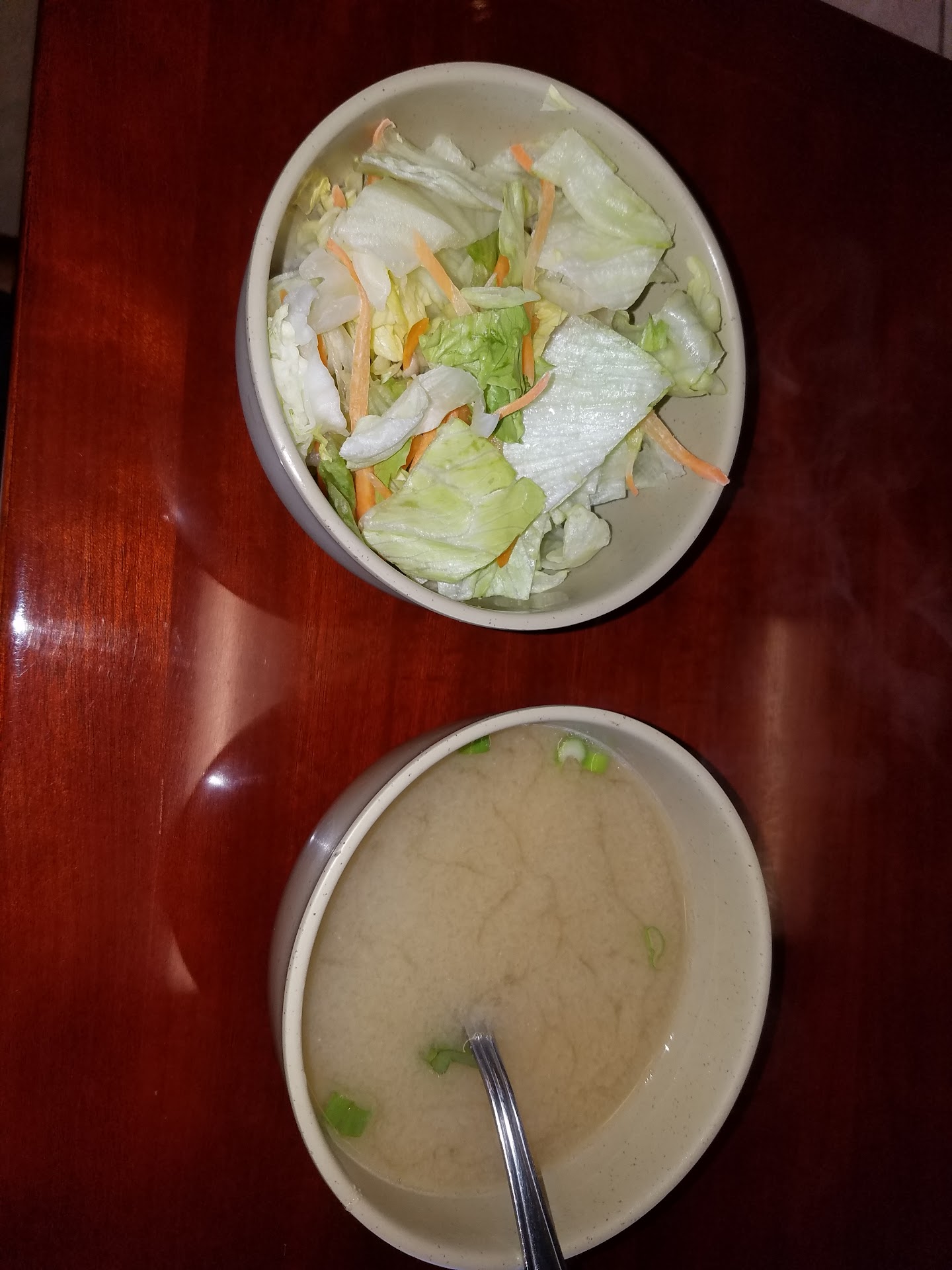 I hope you enjoy miso soup with MSG in it. I hope you also enjoy eating a bowl of iceberg lettuce with a few carrot shreds in it that they call salad. The ginger dressing is nothing more than Thousand Island. It doesn't even taste like there's any ginger in it, more like ketchup, mayo, and vinegar.