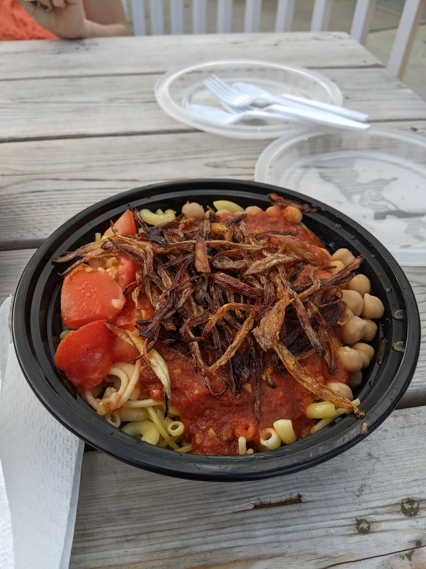 This falafel was nothing close to the flavor and texture of an authentic Egyptian falafel sandwich. The falafels didn't have the traditional amazing mix of spices and pops of flavor (true Egyptian falafels are made with fava beans instead of chickpeas, and have a mix of many tasty spices, including fennel), the tahini had the texture and taste of hummus, but with way too much cumin, the pita tasted like a cheap store-bought kind, and the overall texture of the sandwich was mushy, including the tomatoes. The koshary noodles tasted overcooked and the flavor of the sauce and the whole dish wasn't great.