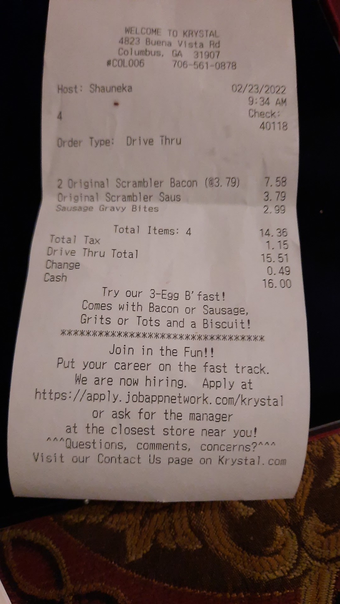 As you can see by my receipt, I ordered an Apple turnover for dessert. Well, I was informed that they didn't have any sweet tea, which if they saw that I ordered tea, they would have also saw my apple turnover since it was right below the tea on the receipt. But guess what, I get home no apple turnover was in my bag 🙄🤯🤬...both bags were stapled closed,(Krystals in one, chilli cheese fries in another) so I didn't check my order, before I left but I wish I had. It's cold out, and I didn't want to go all the way back to the restaurant. $2.09 - Apple Turnover - 😔