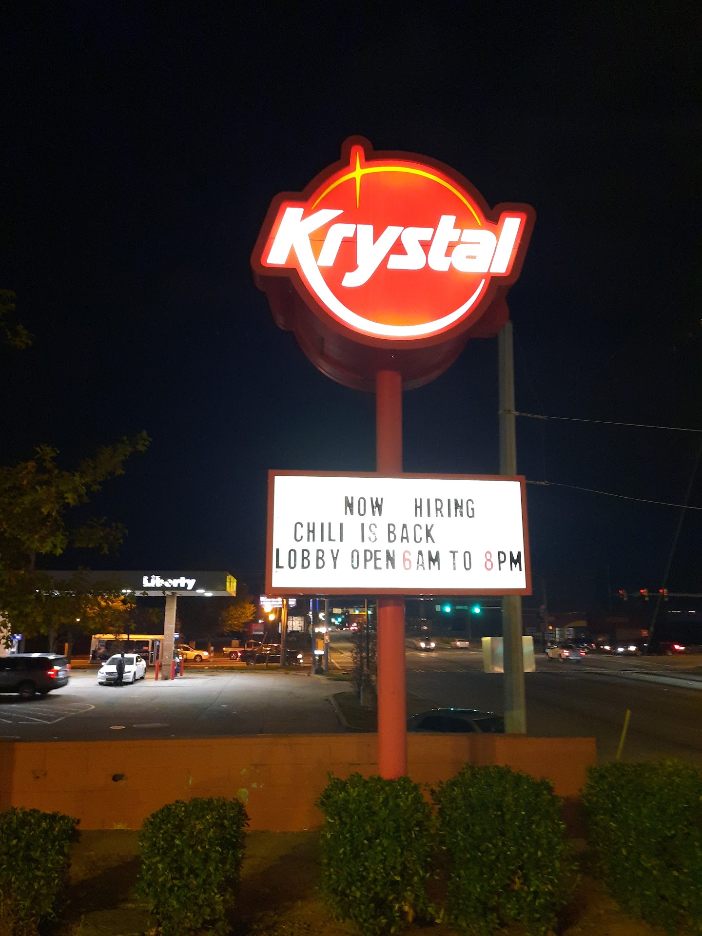 Read moreThis is the absolute worst Krystal I've ever been to. Grossly overcharged me. $26 for 2 people ? ( 8 cheese krystals and 2 krystal chiks. Menu board clearly stated 12 cheese krystals for $10.99 and 3 chiks for $5.99.) When I inquired about the price I was told "let me ring it a different way" . Had to pull into the parking lot to wait on my order. 10 minutes later I see an employee wandering around the parking lot before going back inside. 10 more minutes and the employee came to my vehicle and asked if I was waiting for an order. The order was wrong, it was short one burger. I asked to please correct the order. The employee went back inside only to send a different employee to my vehicle. This big burly man walked up to my vehicle and tossed the bag in my lap. When I asked if the order was corrected he turned around and walked away. No comment, NOTHING. VERY RUDE!!! To top it off, the food was cold ! There is obviously a management problem, and corporate should be ashamed of this restaurant. Don't worry, I will never, and I mean NEVER go to this...