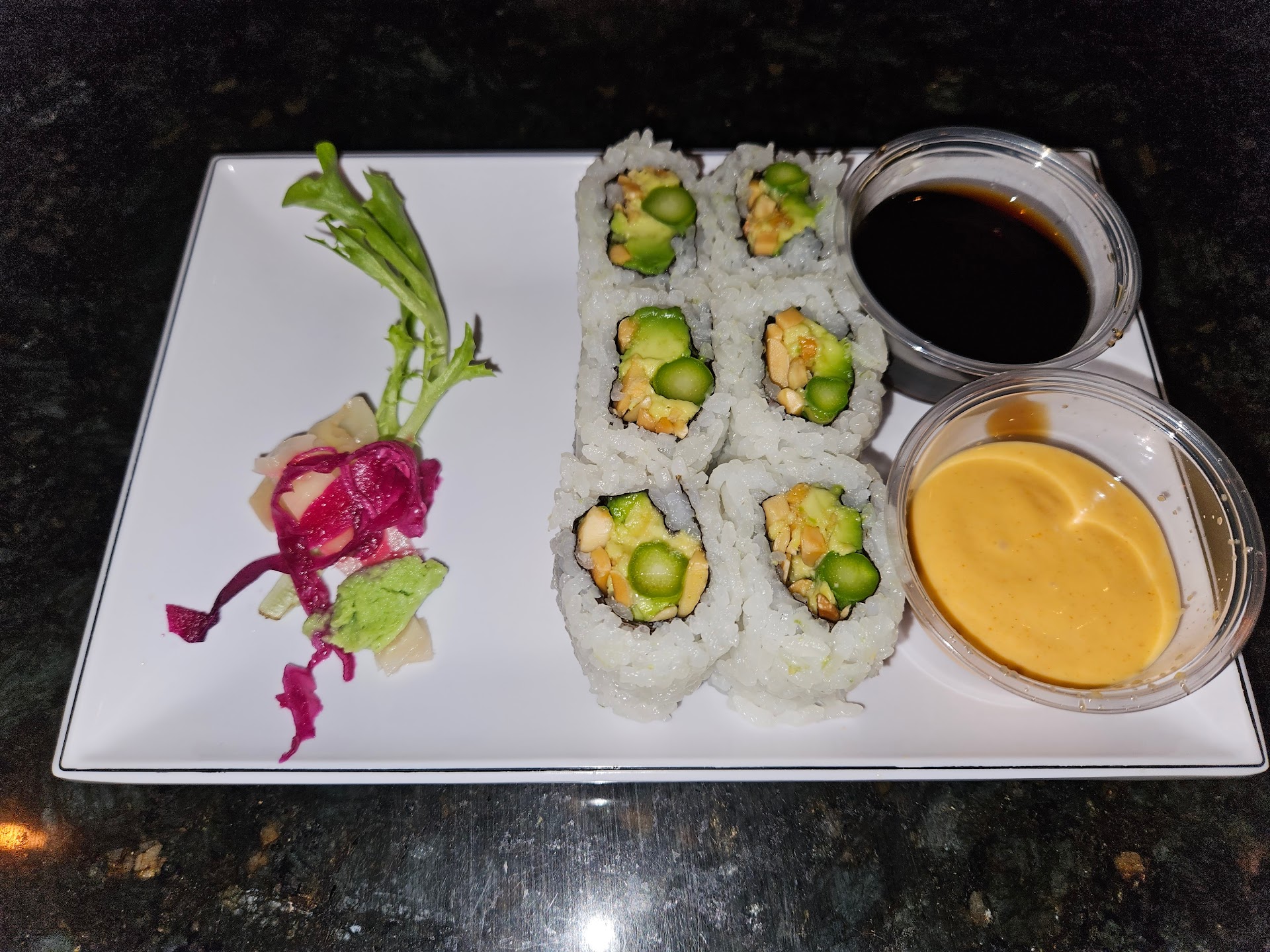 For dinner my wife ordered the "Black Widow" sushi roll. It didn't seem like anything to write home about, but she said she liked it well enough. I ordered the Bento Plate in order try try their sashimi as well as some nigiri. It came with Miso soup, which was good, the tofu in it was well-prepared. The BBQ Eel Nigiri (2 pieces) was good as well. The tuna and salmon sashimi were tasty, the portions were generous and they were served in the shape of a flower or rose, which was nice. The Bento Plate also came with grilled shrimp with teriyaki sauce. The sauce was okay, nothing special, but the shrimp, to be honest, were just not good. I don't know if they were not fully-thawed before being grilled, or if they were grilled and then sat around while the rest of the meal was prepared, but by the time we ate them they were fairly rubbery and room temperature. Lastly, as I was finishing the tuna sashimi, I discovered a gnat in it. I don't know if the gnat had been in the sashimi itself or if it had been on the big, green leaf on which it was served, or maybe it just flew in there at some point during the meal, who knows. We didn't order any dessert, so nothing to say on that point.