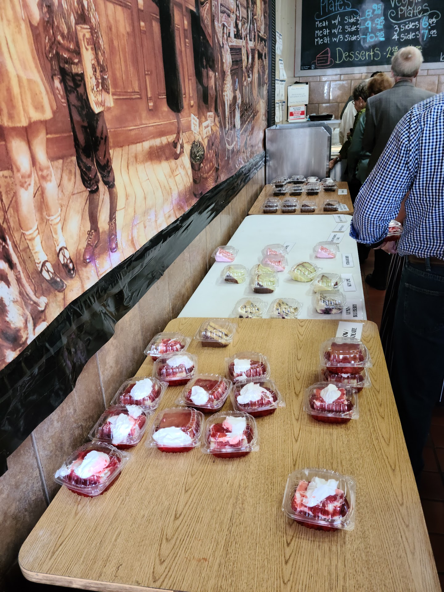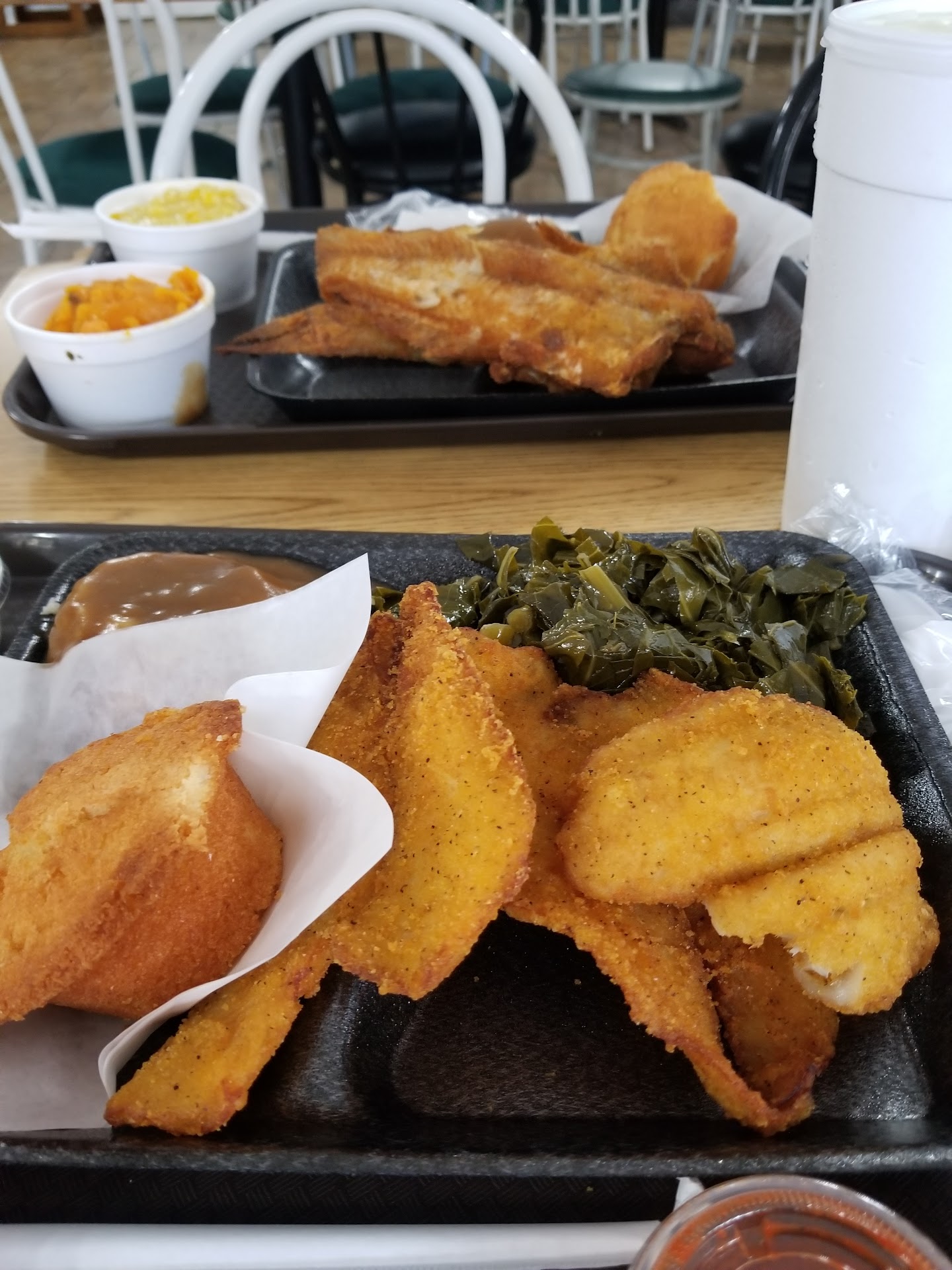 We visited this spot while traveling two weeks ago searching for good soul food spots. I have to say, the customer service was on point. Everyone went out of there way to ensure we felt as though we were at home. The food: I had chicken and dumplings and they were very tender and a little salty. I had fried chicken as I read that this was their most popular item so I had to try it. It had a good flavor, however most disappointing, as it wasn't cleaned thoroughly. There were feathers on it and the yellow plastic marker that is on a drumstick wasn't removed and assumably, they may have thought that frying it would disguise it, but as an avid cook myself, I identified it quickly. I also had their dressing, it was rather dry. The collard greens were seasoned quite well and very tender. My husband had country style steak and mashed potatoes...which was excellent...they definitely over added gravy but we just moved it to the side. He also had Mac and cheese and it tasted like it had powder fake cheese,not good. He also had yams of which weren't good at all. They tasted canned and no real effort put in to them having a more authentic taste. The red velvet cake and the carrot cake were both extremely dry and too sweet, which is a bad mix. The desserts tasted like they had been sitting there for days. Also, while eating, we observed an employee walk through to clean the tables and he took his hand to "wipe down" the table. Given our current climate, at the least there should be soap and dish cloth to clean the tables after people eat. This was disappointing. All in all, I gave them three stars because customer service was a win. But there needs to be a balance between the food and the service. People, clean your meats thoroughly; And the cleanliness in your restaurant as the consumer is trusting that you maintain a clean establishment to eat in; this can make the difference between a great experience and potential sickness or even further, a law suit. Not interested in eating here again, I've seen enough to know that there is work to be done there. You got the customer service down, now pair the food quality and overall cleanliness with it and all will be well for the...