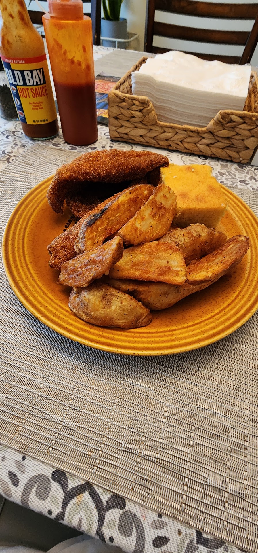 Found this place online via someone else's post. Everything looked good and I wanted to try this place so bad. Since moving to Columbus I have not found a good restaurant that offers fried fish. I told my wife about this spot and she said let's go. The location is nice and the building is very clean. Upon entering, this place was very easy to find and we placed our order online so it was ready to pick up when we arrived. However when we arrived, we were not greeted although the cashier was helping another customer but there was someone else that was standing there and looked directly at us and didn't acknowledge our presence. When the cashier noticed that we were standing there and asked if we needed to order I let her know that we ordered our food online and that we were here to pick up and she casually pointed to the bag and told us that we could take it. I took our food bag and checked the ticket to ensure that it was ours and we left. Upon arriving home we inspected all of the food and everything looked extremely delicious. The catfish was seasoned well and fried nicely and the JoJo fries were season perfectly and cooked to my satisfaction the only thing that we did not care for who was the cornbread because it was a little on the dry side. We will go back to enjoy more of the fried fish and try some of the other side.