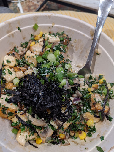 The bowl included: Chicken in a sweet brown sauce, marinated kale, roasted corn, a few mushrooms, pickled onions, and spicy kimchi. You have your base choice as either marinated kale or brown rice. For my free bowl I got the rice base and haven't tried that yet. 1 bowl will give me 2 meals for sure.