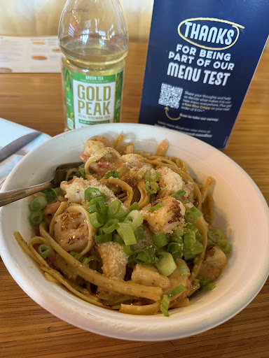 The menu gives you a clear definition of each entree, sides and drink options. The menu is on the wall after you enter, behind the registers, painted as decoration in the hall/dining area leading to the north as well as physical, colored placemat sized menus. The dining room is streamlined and functional with a good flow. The all glass front allows lots of light to brighten by day and allow an interesting view of well lit buildings across the way. The restaurant is clean and the service is friendly as you are greeted with smiles as you enter and order. After you place your order, you are given a table number (if you are dining in) and drink cup. A beverage display case is between the registers with bottled waters, juices and milk options. The beverage/ice dispenser is conveniently located next to a neatly compact condiment counter offering communic bottles of hot sauce and signature seasoning shakers as well as chop sticks, sliced lemon, to-go containers, extra napkin straws straws. On the other side of the condiment area is the "Noodle Nook" offering a bowl of individually wrapped "Chopstick Buddies" and prepackaged activity pages with crayons. You will enjoy dining-in as there are many tables and booths along with two counters with stools. The only negative both times we've dined in, is that only the main entrance has a climate/wind blocking foyer. Many customers also use the other two side entrances that result in the dining areas being very very cold. (It was below freezing each time we dined in.) Their food is quite tasty and the menu offers both zucchini noodles and cauliflower noodles in addition to the flat noodles, spaghetti noodles and elbow shapes you would normally expect. You will enjoy watching the chef prepare each entree in the row of skillets lined up waiting for noodles, where he then creates the magic for your taste buds by adding the sauces and seasonings specific to any one of the twelve entrees offered. Come, dine, enjoy! Once you have tried each entree and have chosen a favorite, you'll return again and again for food that is fresh, light and a delightful experience for your mouth. You...