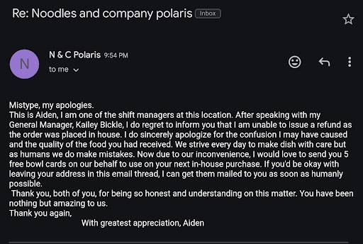 Read moreWe stopped in to order supper for my family after waiting I was advised they ran out of rice noodles, so I told them I would be back in 30 minutes. Upon my return my order was ready I picked it up and came home. We open the meals and the noodles are still uncooked, the rice noodles are under cooked with stiff cores. I called the store to complain after waiting for 15 minutes on hold they take my email address. Below is they response absolute horrible. This is Aiden, I am one of the shift managers at this location. After speaking with my General Manager, Kailey Bickle, I do regret to inform you that I am unable to issue a refund as the order was placed in house. I do sincerely apologize for the confusion I may have caused and the quality of the food you had received. We strive every day to make dish with care but as humans we do make mistakes. Now due to our inconvenience, I would love to send you 5 free bowl cards on our behalf to use on your next in-house purchase. If you'd be okay with leaving your address in this email thread, I can get them mailed to you as soon as humanly possible. Thank you, both of you, for being so honest and understanding on this matter. You have been nothing but amazing to us. Thank you again, With greatest...