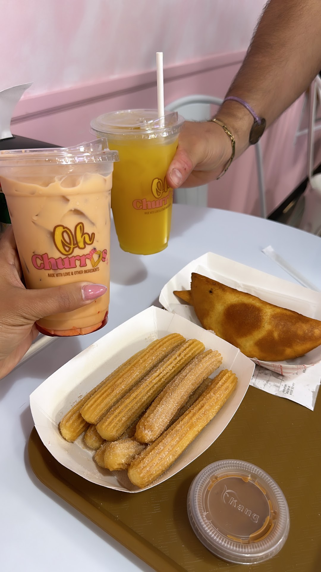 I always get some type of churro and I've tried their bites and regular options, with either dulce de leche and condensed milk. I love both sauces and would love to try their other options. Their churros are crispy, chewy, fresh, sweet, and incredible. I don't think I've had a better churro! They're absolutely delicious. I got their Strawberry Thai iced tea to try once and it was good. I would like to try their other drinks and foods!