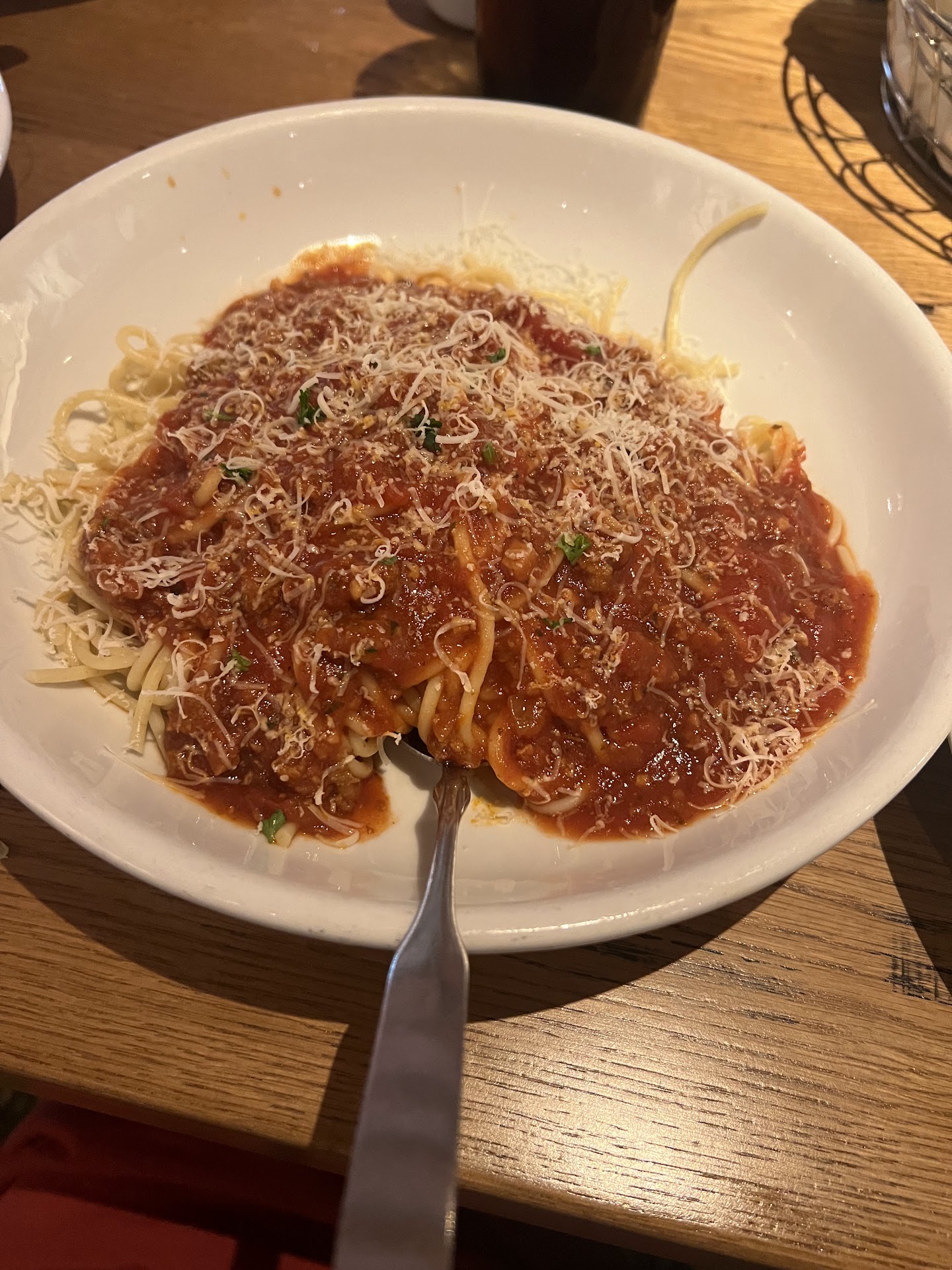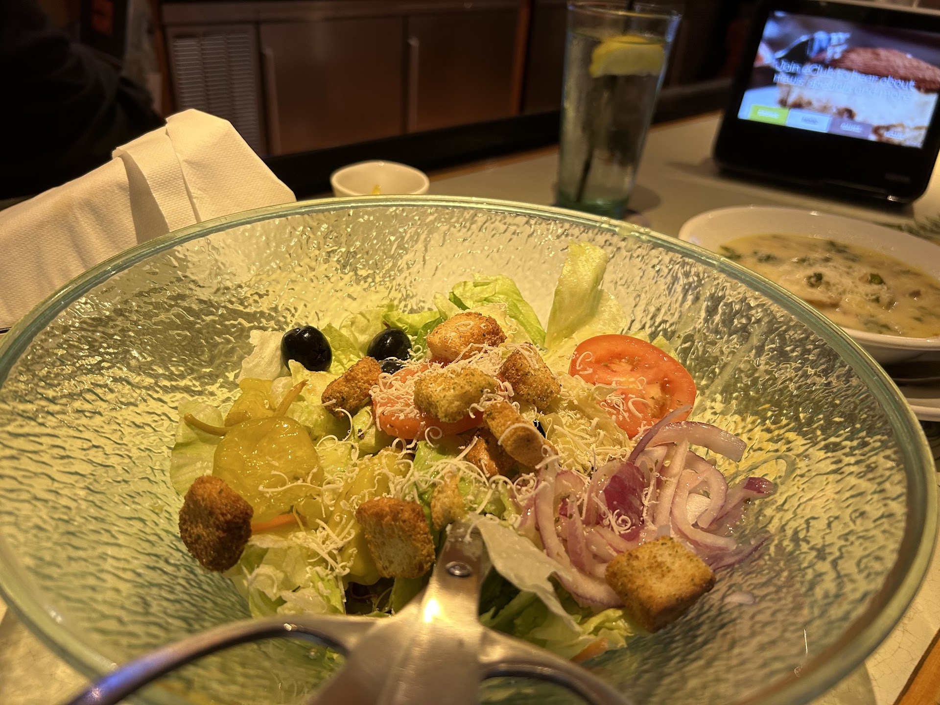 I rated this restaurant high for food and atmosphere because it was not crowded and we had a lovely semi private table for our group of 7 people meet & greet. The food is the same as it is at every location, love the salad, pasta is basic but good, etc. But the service was TERRIBLE. Our server took over 5 minutes to get to the table. We considered ordering through the table top device but couldn't figure out the soft drinks and gave up. So we were frustrated when he took so long. I ordered an unsweet iced tea and another person ordered a sweet tea, and another person ordered a diet coke with no ice. When he brought our drinks they all had almost no ice. Mine looked dark so I asked if it was unsweet and the server said it was. I took a sip, while he was still at the table, and it was not unsweet. I said, "Oh no, this is sweet yuck." But he ignored me and walked away. The sweet tea person, sipped theirs and discovered it was unsweet. We both put our tasted drinks aside (we are strangers) but the server never came back and we ended up just trading tasted drinks eventually. A food runner brought out our food and the server brought out our salads but didnt bring the parm and after a while we got tired of waiting and just served the salad. Then he never refilled our drinks and we needed to eventually ask someone if they could refill our drinks for us. As we finished eating we began to pile our dirty plates at the end of the table as a hint that we were finished but he never came to clear them. A friendly manager did stop by and ask if everything was okay, and because I was at a table with people that I had just met I didnt want to complain about anything but even she only took one plate and left the other dirty plates there. The server brought the bill and wordlessly handed it to me. AND finally he decided to give me his undivided attention but standing over my shoulder, without saying a word, No thank you for coming, how was your meal, etc. but loomed over me waiting until I signed it. And I am embarrassed to admit that I felt pressured into adding a 20% tip because he was standing over me. I am a coward who only gives my honest reviews on the...