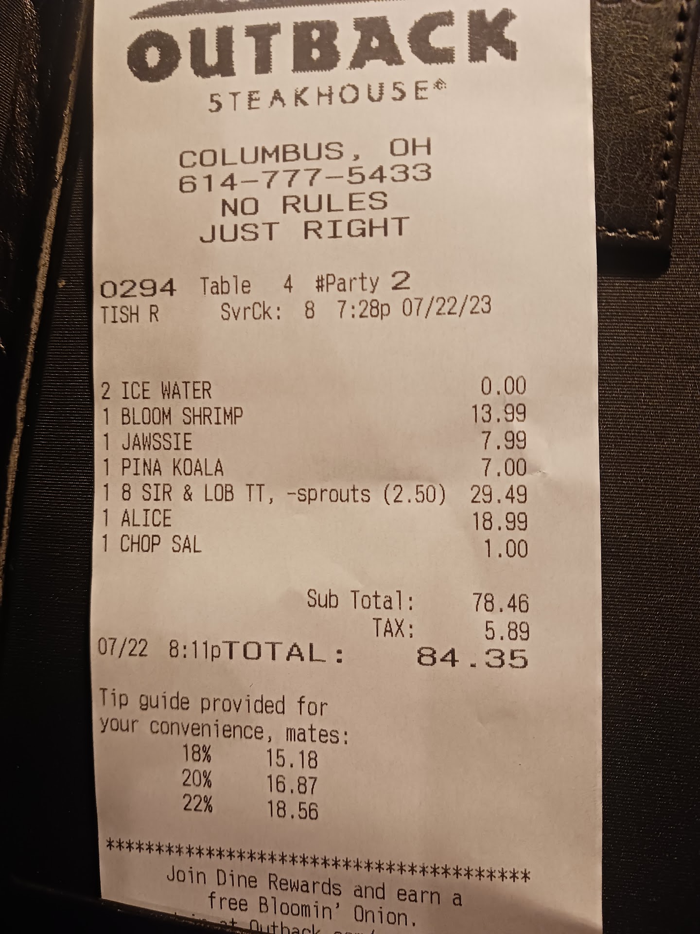 Read moreNot great and will not return for the prices, there are better options out there. We were seated immediately but nobody came to talk to us for at least 8 to 10 minutes. We were seated at a dirty table too. When we met our server, Tish, she was wonderful and on top of the whole meal. Started with the Aussie Jawssie which was good but super super fruity almost like it was half syrup. Also tried the Pina Kola and it was aweful. Tasted like rubbing alcohol and brown sugar. Not like any Piña colada I have had before. I couldn't drink it and had my boyfriend finish it. We got the bloomin shrimp and they were not bad at all but not as good as bang bang shrimp at Bonefish Grill or Longhorn's shrimp. Boyfriend got the surf and turf with medium rare steak. The steak was cooked perfectly but way underseasoned and I could tell he did not enjoy it as much as he normally enjoys steak. Lobster was good but needed some more flavor too. Baked potato was dry and super salty so it was hard to enioy the skin. Brussel sprouts were not bad either but a huge portion and they smelled foul when we took them home. We have brought cooked brussels home from resturants before that do not smell so strong. I got the Alice chicken and pecan salad. Pecan salad was excellent and only $1 upcharge. Well balanced flavors and good portion, even if it did not look all that appetizing. The chicken was just a bit much altogether I would say. A lot of bacon and cheese with mushrooms and honey mustard. The flavors were not bad but weird. Chicken was really dry. Same situation with my potato being salty and dry. When we finished our meal and paid I felt really naseous but never got sick. I believe it was just all the combination of flavors between the chicken, shrimp and blue cheese...