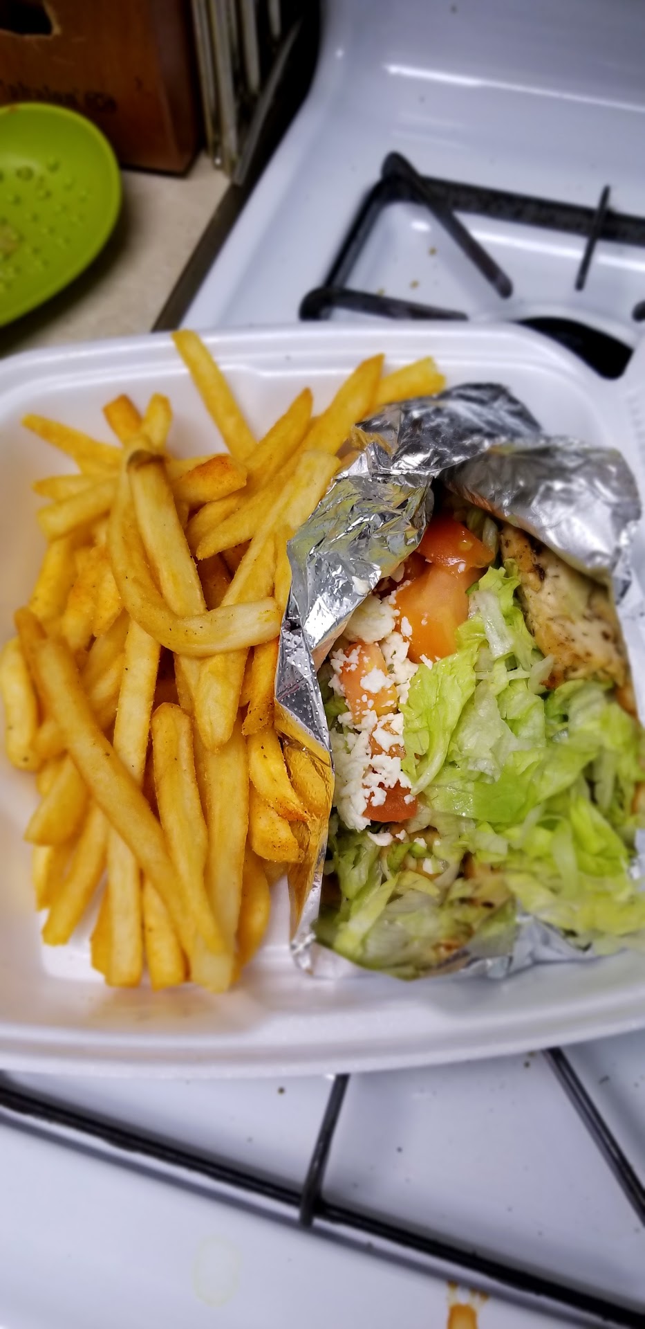 The quality wasn't quite so generous. The noodles were fine, well cooked, and simple with just some parmisan sprinkled on them. The fries were hot, but seemed stale. Unfortunate because they're the good crispy kind. I can't soak for the regular gyro, but I had the spicy chicken gyro, and it was slightly overloaded with feta, perhaps my fault because I'm not a huge fan, and the chicken was clearly precooked, and reheated on a flat top grill-it was dry and tough. Steam and sauce on the flat top would help the reheating process.