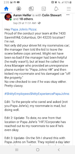 Read moreThe only reason I give it 3 stars is because of past experience. My last, and final, experience with this Papa Johns was dreadful. The pizza I ordered was as flat as a flatbread pizza. As I sat and waited for them to make me another one, a few customers came in and ordered pizzas. When customers walked outside to wait for the pizzas to be made, the two employees working there began to complain about how the customers had the nerve to order so many pizzas. I understand there was only two of them, but it was in the evening and the customers can't help the lack of employees working. I'll give them credit by saying they did make a pretty good do-over pizza, which means they do have the ability to make a good pizza but only so when you put them on spot to do so. Went to Dublin Muirfield Papa Johns a few days later, no...