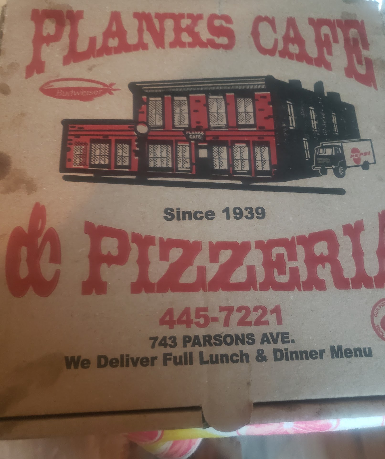 Plank's Cafe and Pizzeria is in a historic building that had been built in 1930; they have been in business since 1939.
